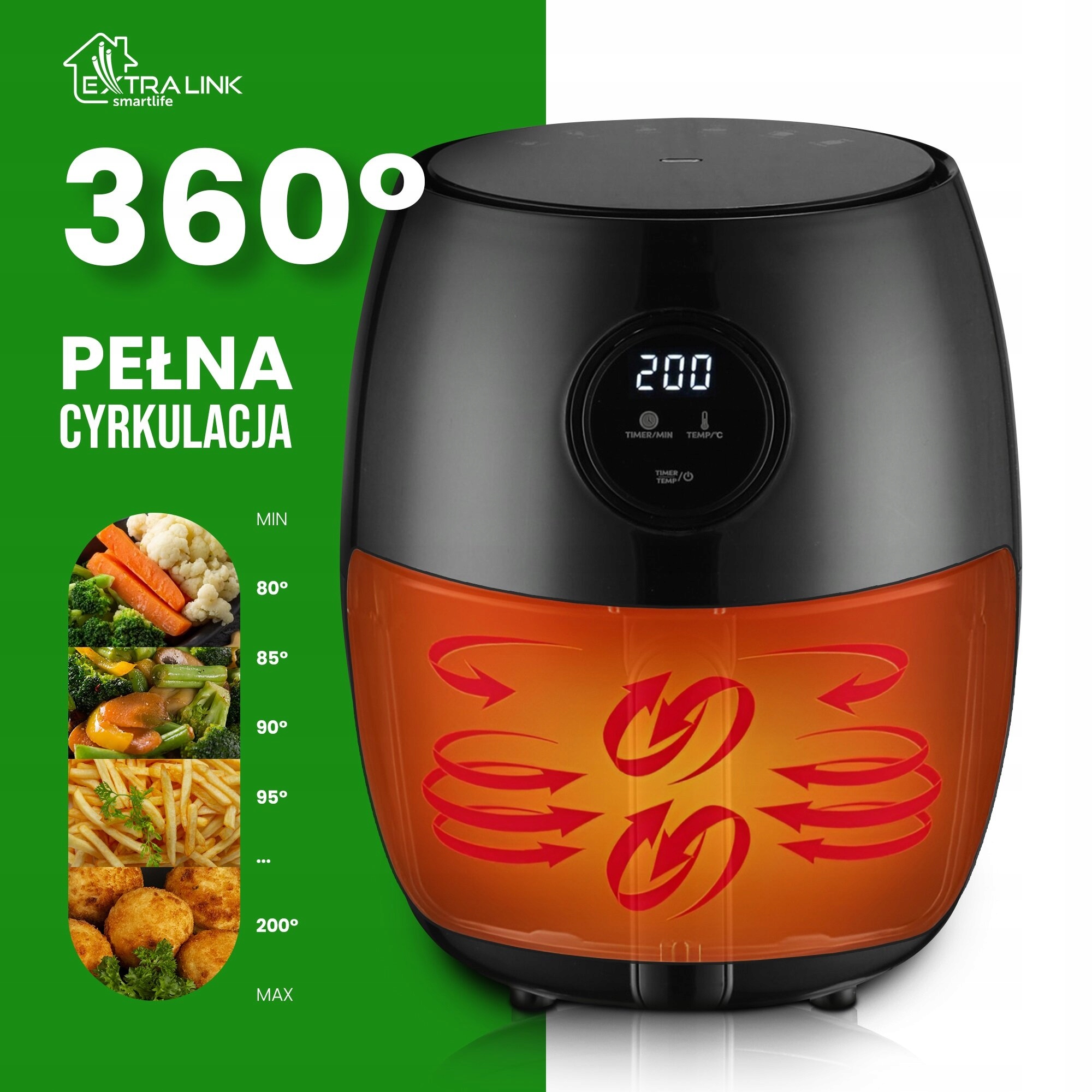 Frytkownica EXTRALINK nie tylko promuje zdrowe nawyki, ale również pozwala zaoszczędzić cenny czas w kuchni. Dzięki efektywnej cyrkulacji powietrza, proces gotowania jest znacznie krótszy w porównaniu do tradycyjnych metod. Co więcej, równomierne rozprowadzanie ciepła zapewnia perfekcyjne efekty bez konieczności częstego obracania potraw, co oznacza mniej pracy i więcej czasu na relaks.