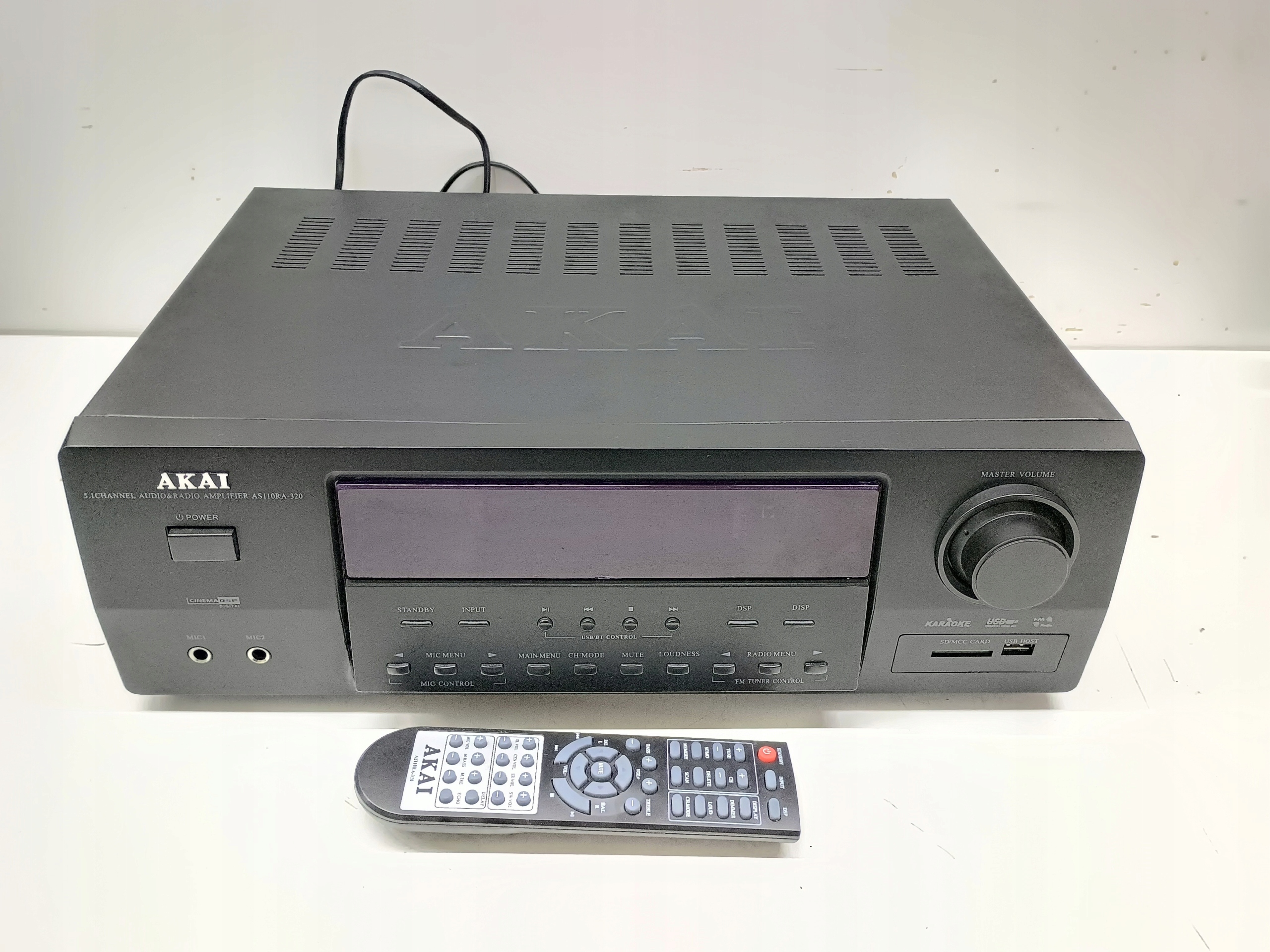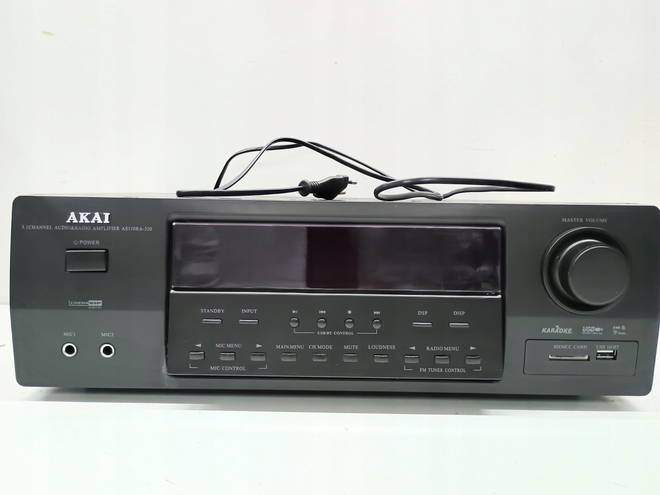 AKAI AS110RA-320 posiada na przednim panelu między innymi slot na kartę SD oraz port USB, przez który możemy również odtwarzać muzykę. Wbudowany tuner FM pozwoli na słuchanie ulubionej rozgłośni radiowej. Amplituner wyposażono także w funkcję karaoke z możliwością podłączenia dwóch mikrofonów. Na wyposażeniu amplitunera AKAI AS110RA-320 znajdziemy również wyjście pre-out, dwa liniowe złącza audio, wejście gramofonowe MM, wejście anteny FM, wejście Aux oraz wyjście słuchawkowe.