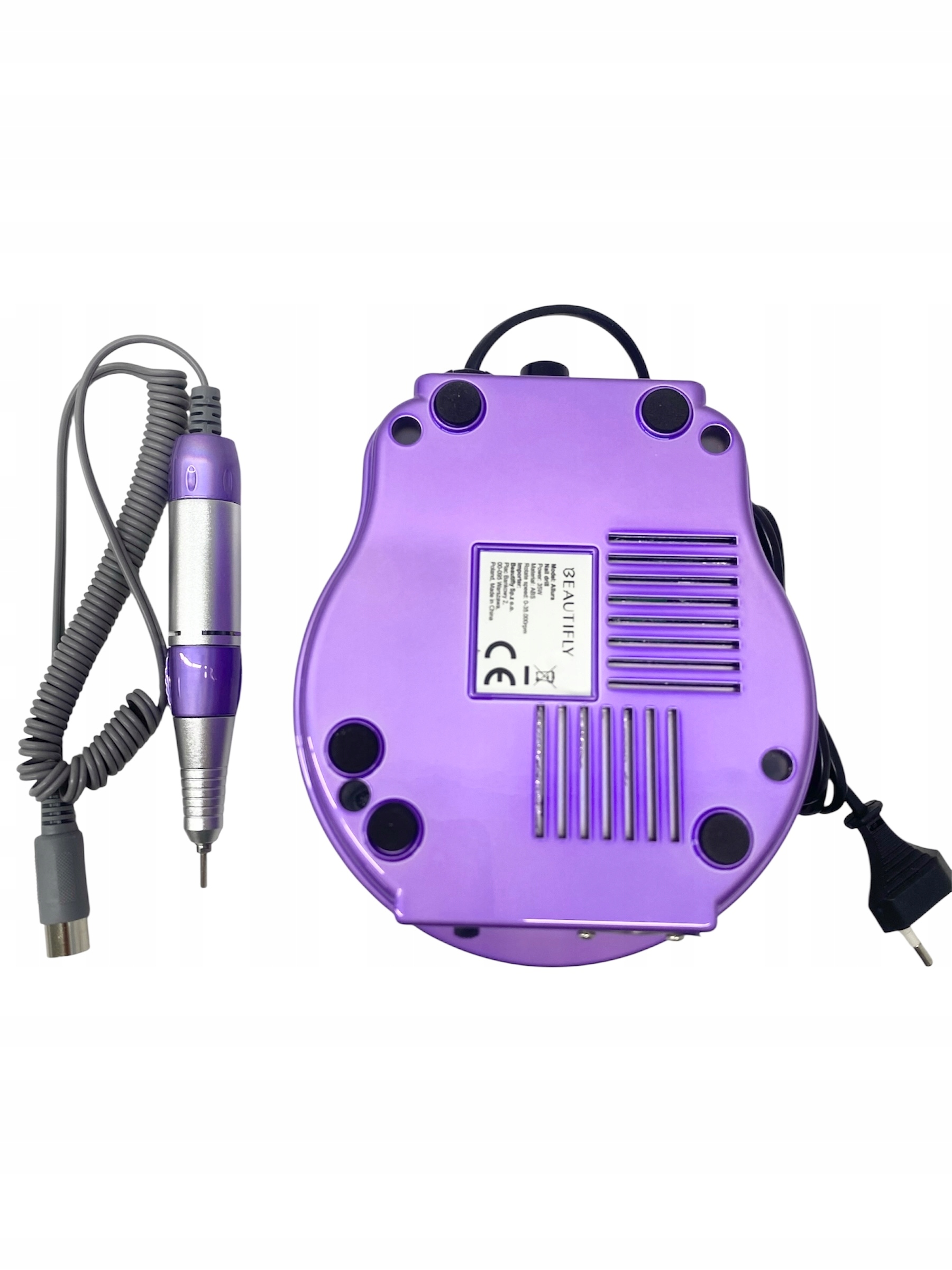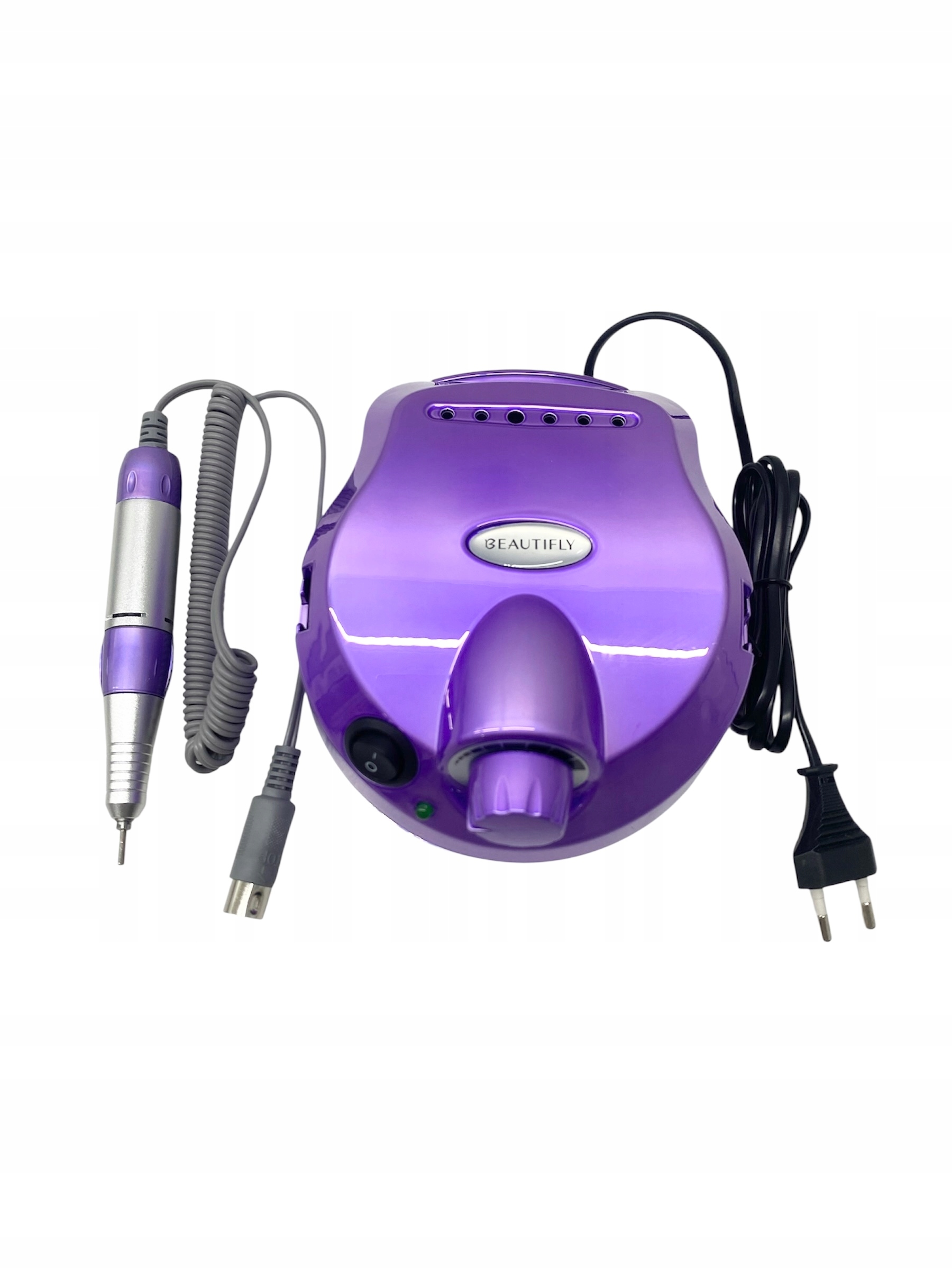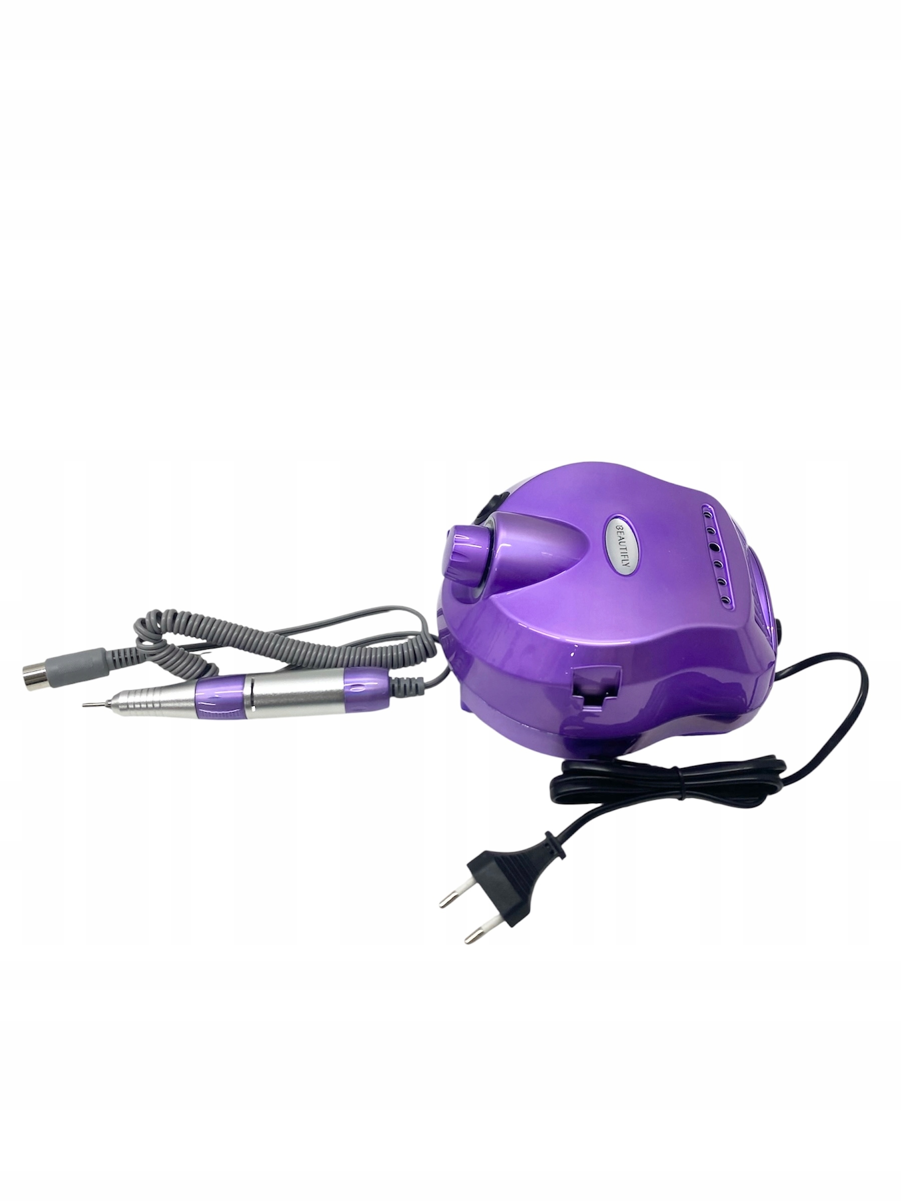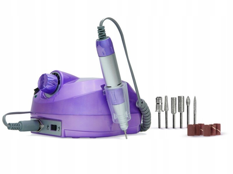 Frezarka do paznokci BEAUTIFLY Allura Nails, baza, głowica, pedał nożny, 6 x frez, 6 x pasek ścierny, stojak, uchwyt pod głowicę, zasilacz oraz dokumentacja.