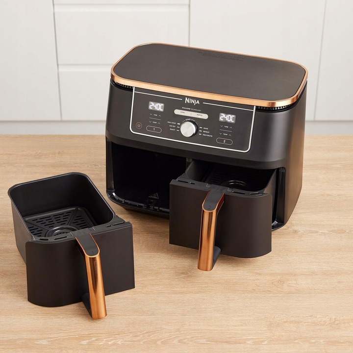 Ninja AF400EUCP to rewolucyjna frytkownica beztłuszczowa, która z pewnością Cię zaskoczy. Jej główny atut to możliwość przygotowania dwóch różnych dań jednocześnie. To dlatego, że wyposażyliśmy Ninja AF400EUCP w dwa oddzielne kosze mogące pracować w osobnych trybach. To jednak nie koniec zalet. Oba kosze mają łączną pojemność aż 9,5 l. Brzmi nieźle? Poznaj bliżej to wyjątkowe urządzenie.