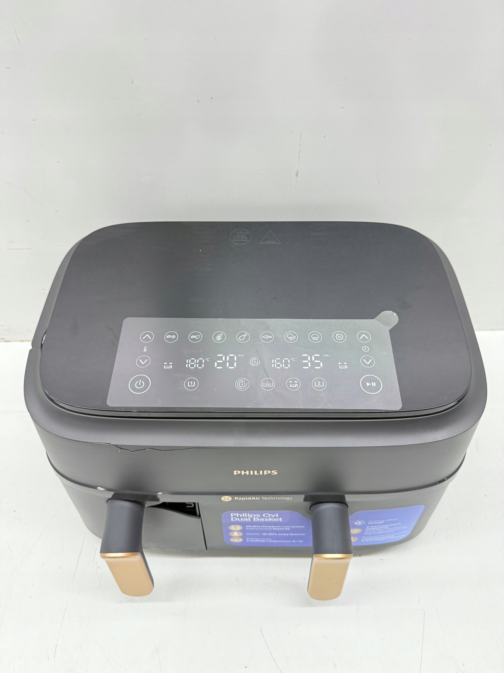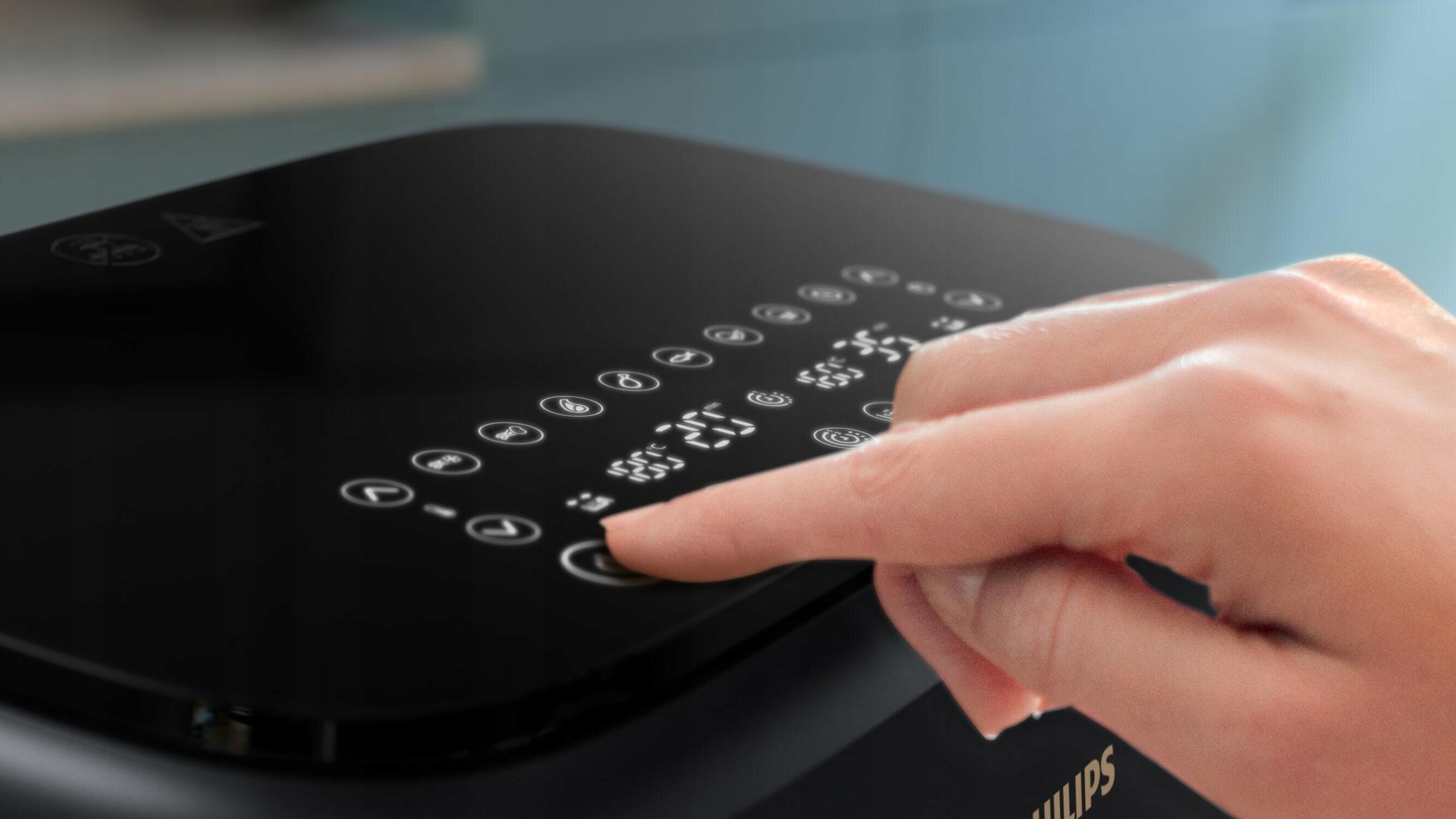 Nigdy więcej sprawdzania i zgadywania ustawień. Na ekranie dotykowym znajdziesz zaprogramowane ustawienia czasu i temperatury do świeżych frytek, mrożonych frytek, kurczaka, mięsa,warzyw, ryb, ciasta lub odgrzewania potraw.