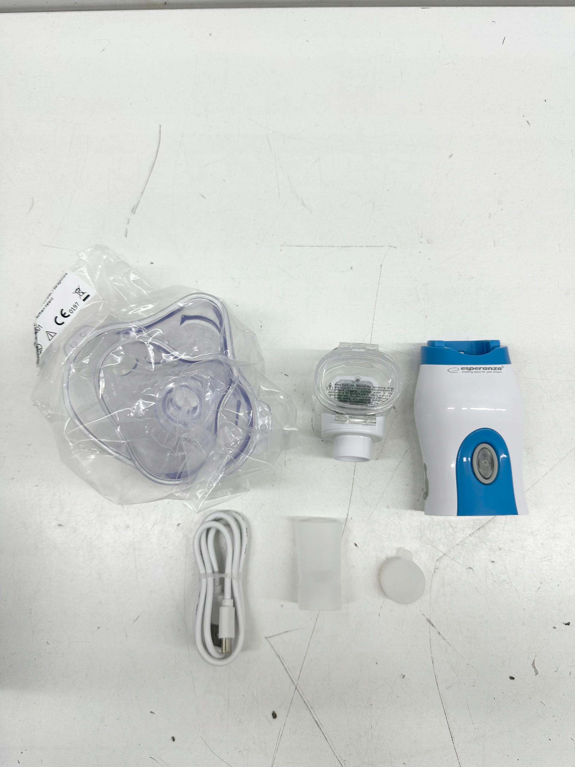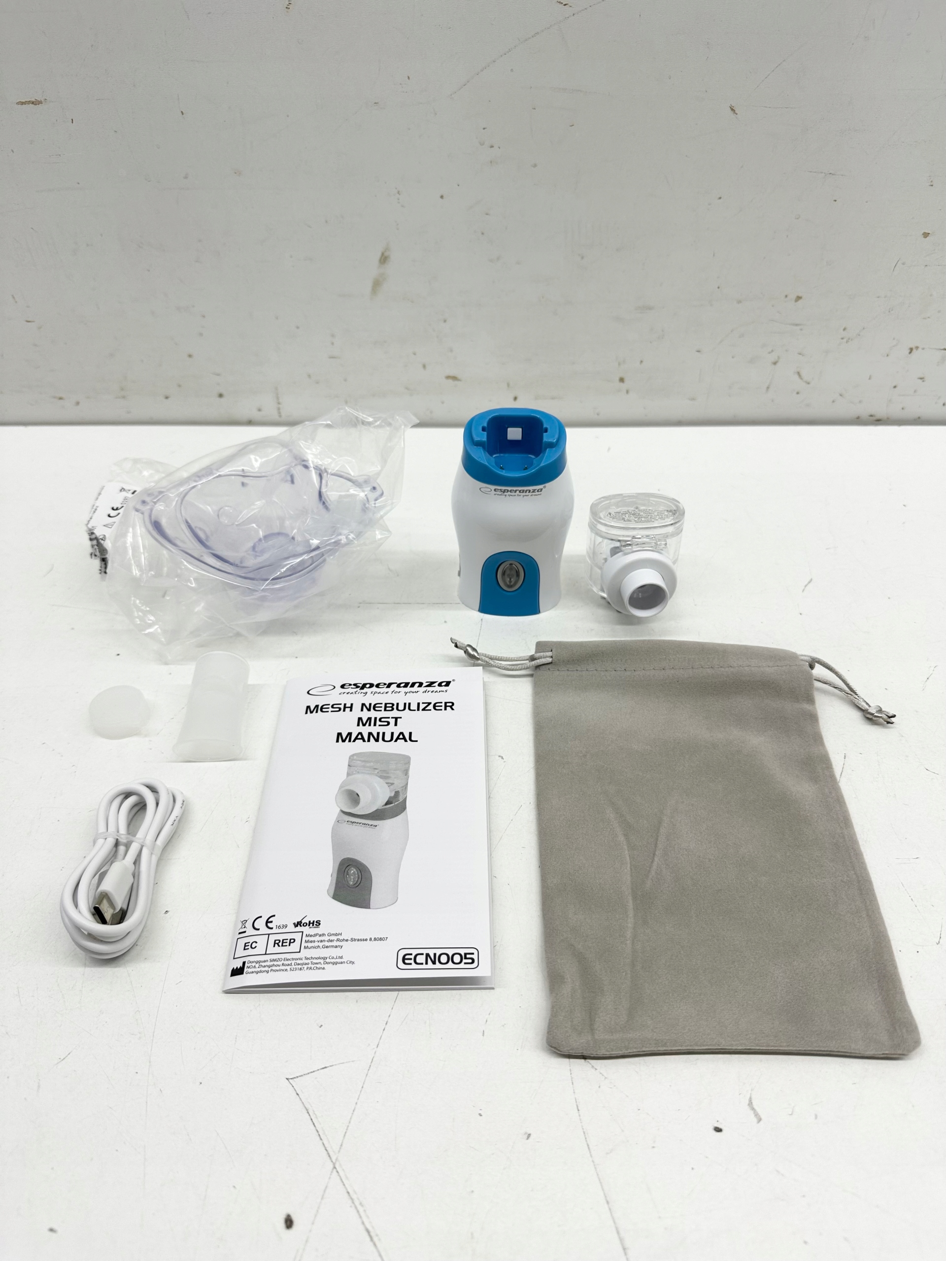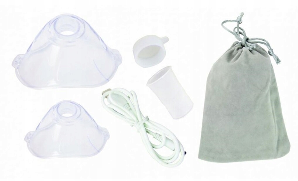 Inhalator nebulizator membranowy ESPERANZA Mist ECN005, maska dla dorosłych, maska dla dzieci, ustnik, etui, zatyczka gumowa, przewód USB-A, instrukcja obsługi.