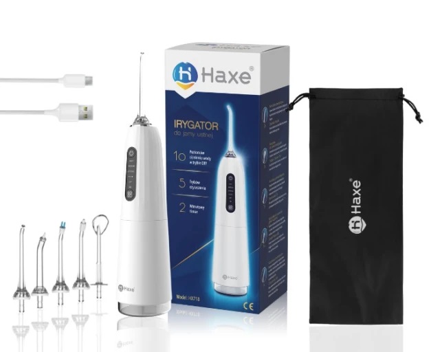 Bezprzewodowy irygator do zębów HAXE HX718 to małe ale innowacyjne urządzenie do irygacji jamy ustnej. Skupiony strumień wody pod ciśnieniem usuwa płytkę, która powoduje powstawanie kamienia nazębnego. Irygator HX718 jest mobilny i lekki, co pozwala na zabranie go w dowolne miejsce. Irygator będzie idealnym rozwiązaniem dla osób noszących aparat ortodontyczny. Urządzenie dzięki 4 gotowym trybom oraz opcji DIY jest uniwersalne i można je dopasować do własnych potrzeb. Irygator do zębów to idealne uzupełnienie higieny jamy ustnej i powinien być stosowany razem ze szczoteczką do zębów. Irygacja nie zastępuje szczotkowania ale jest równie ważna w drodze do zdrowego uśmiechu.