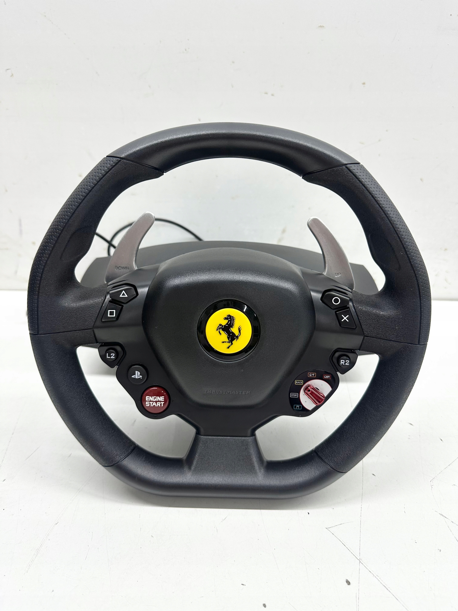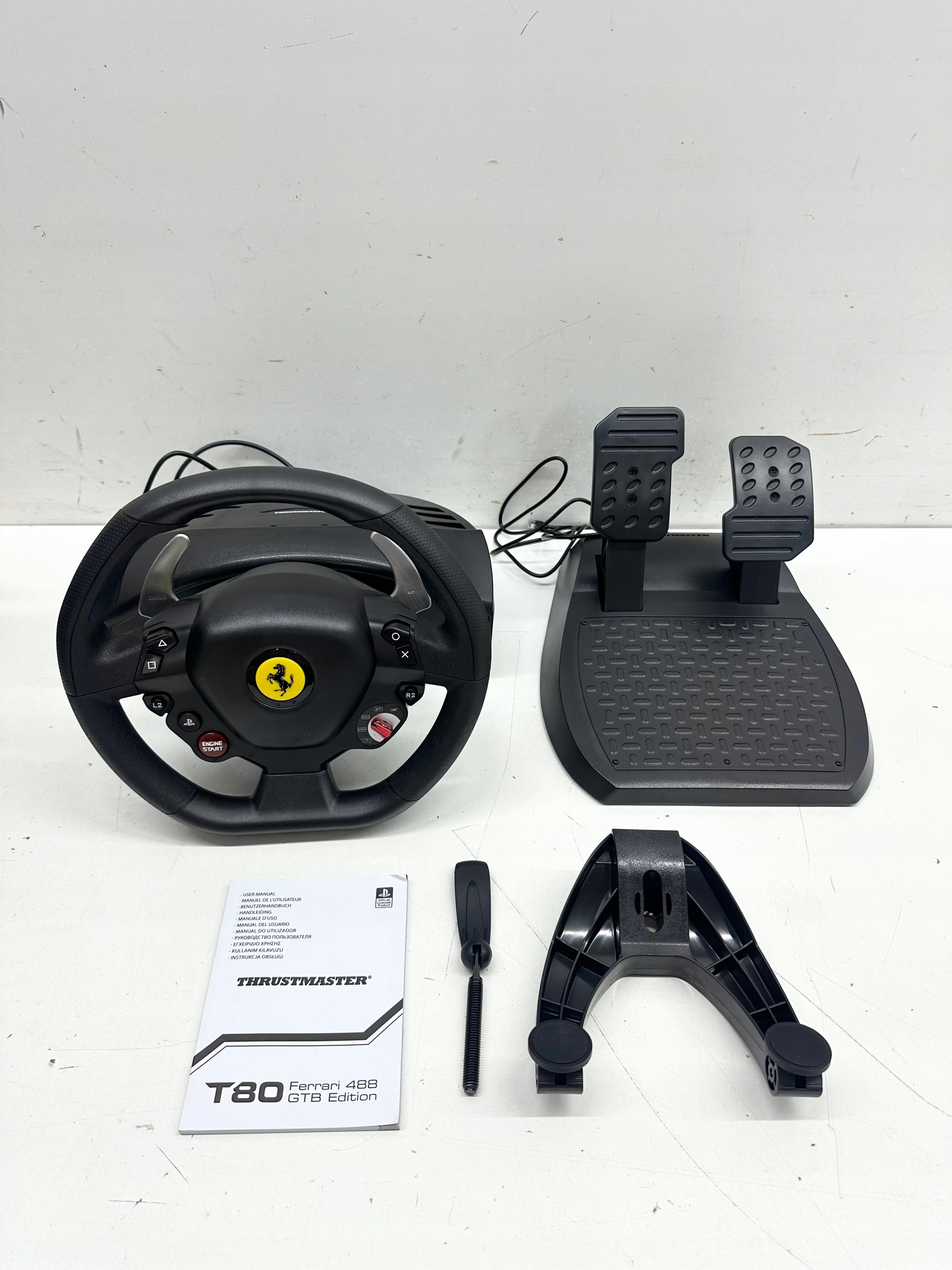 T80 Ferrari 488 GTB Edition w skali 8:10 kierownica z dwoma pedałami w zestawie, oficjalnie licencjonowana przez Ferrari i zaprojektowana tak, by oferować pełny realizm w grach wyścigowych. Ergonomicznie zaprojektowane koło, zoptymalizowane do wszystkich rodzajów gier wyścigowych w systemie PlayStation4 (GT, F1, Stock, Rally, Arcade itp.). Gumowana okładzina na powierzchniach chwytanych. Realistyczny liniowy opór kół z automatycznym ponownym centrowaniem (ekskluzywny system \"Bungee Cord\" firmy Thrustmaster). Kompleksowe sterowanie: 11 przycisków akcji oraz wielokierunkowa konsola D do poruszania się po menu. Sekwencyjne przełączniki zmiany biegów na kole: 2 cyfrowe manetki zmiany biegów w górę iw dół umożliwiają szybsze przełączanie biegów.