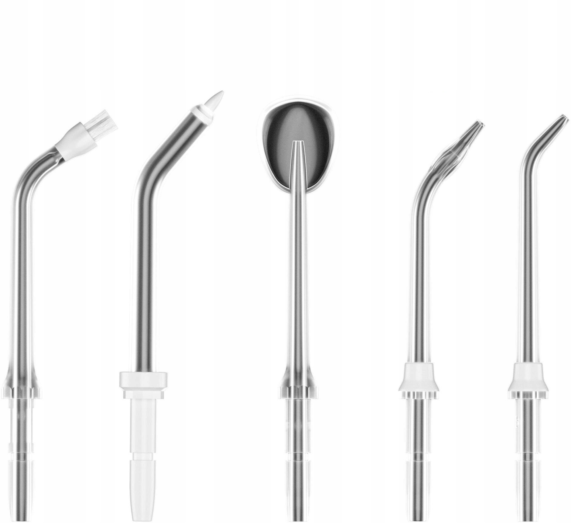 Zestaw końcówek GÖTZE & JENSEN AIR901 pasujących do irygatora GÖTZE & JENSEN IR910: końcówka standardowa do czyszczenia przestrzeni międzyzębowych, końcówka do usuwania płytki nazębnej, końcówka do języka, końcówka ortodontyczna i końcówka do codziennej higieny dziąseł.