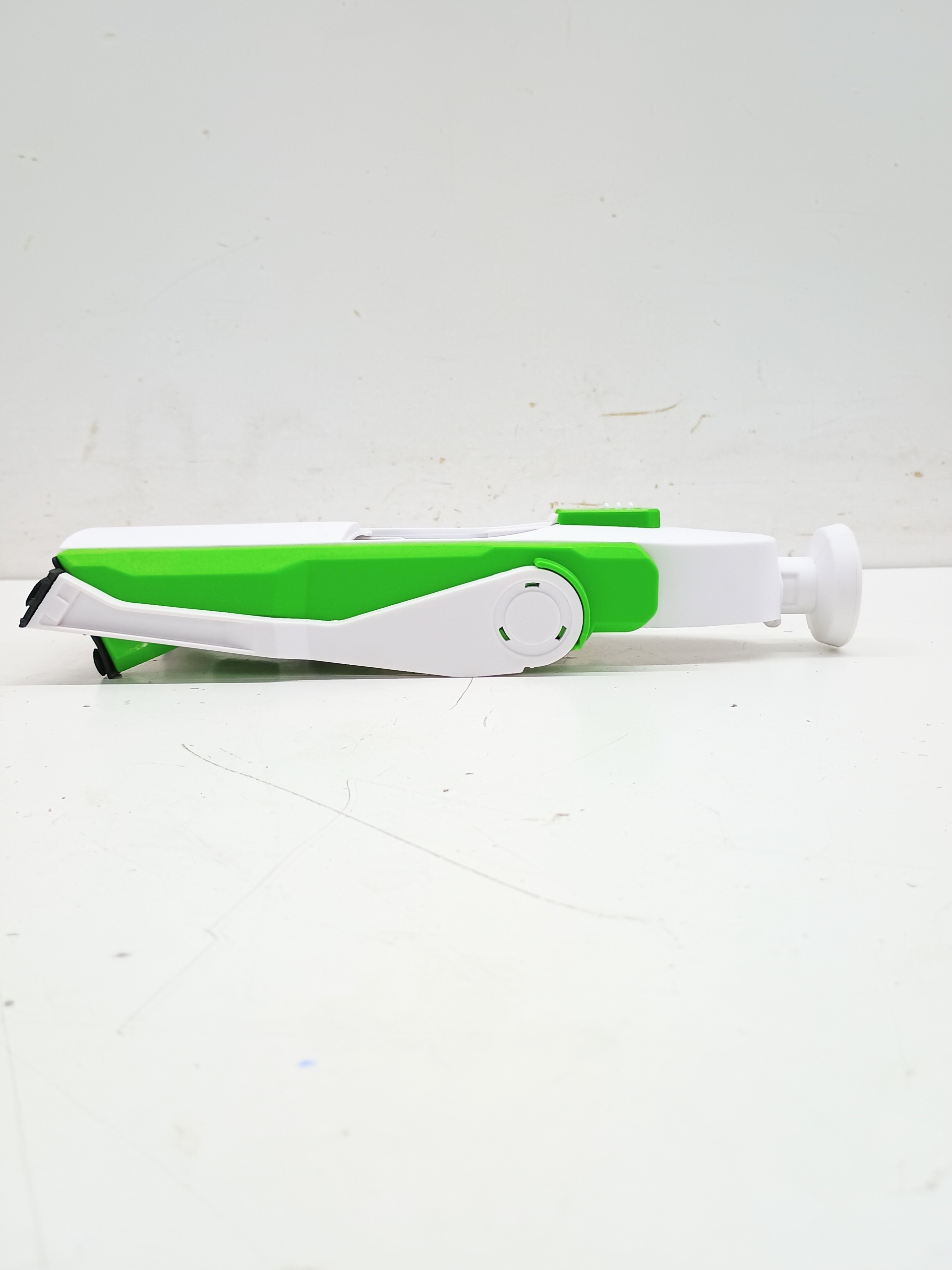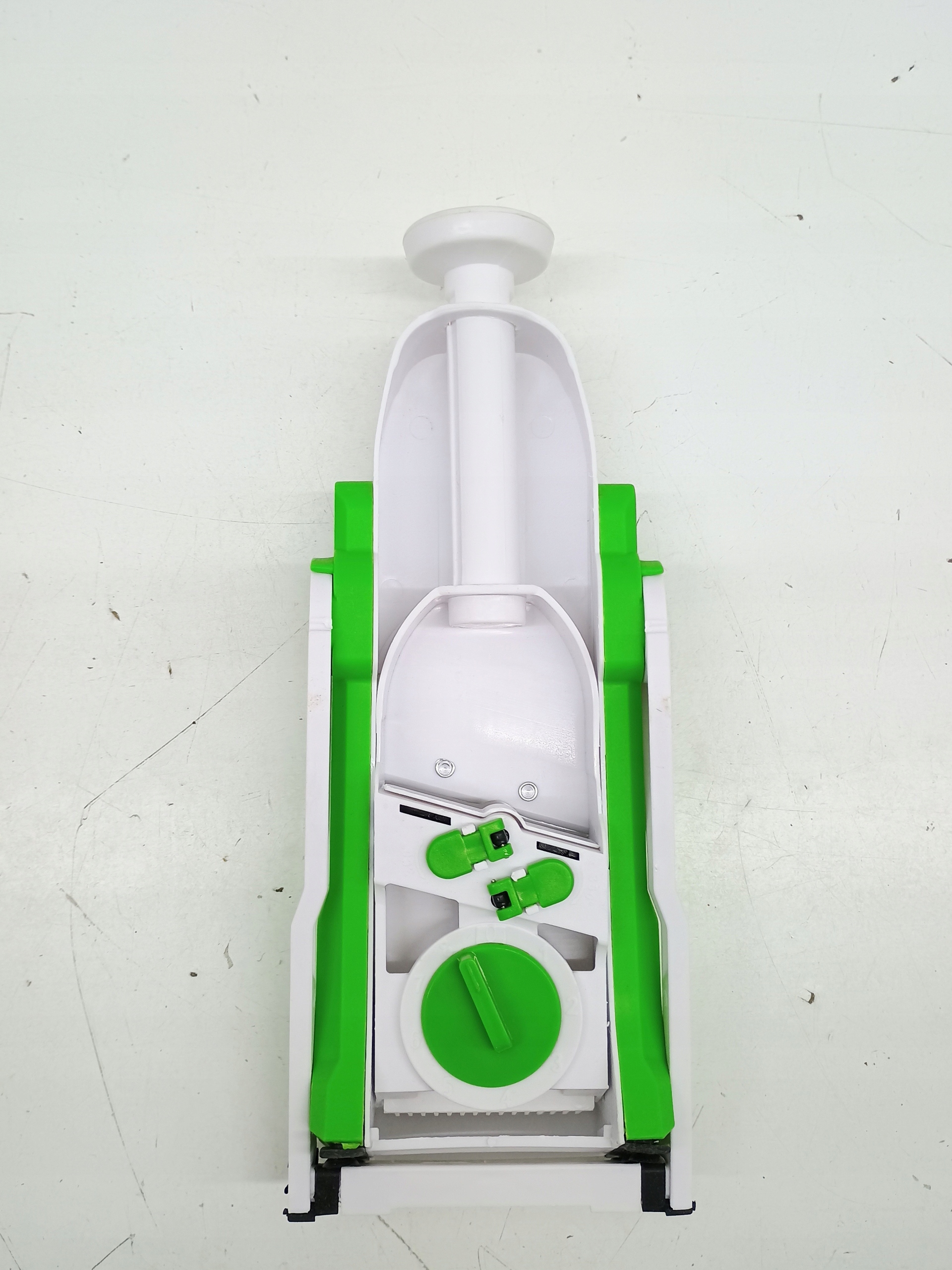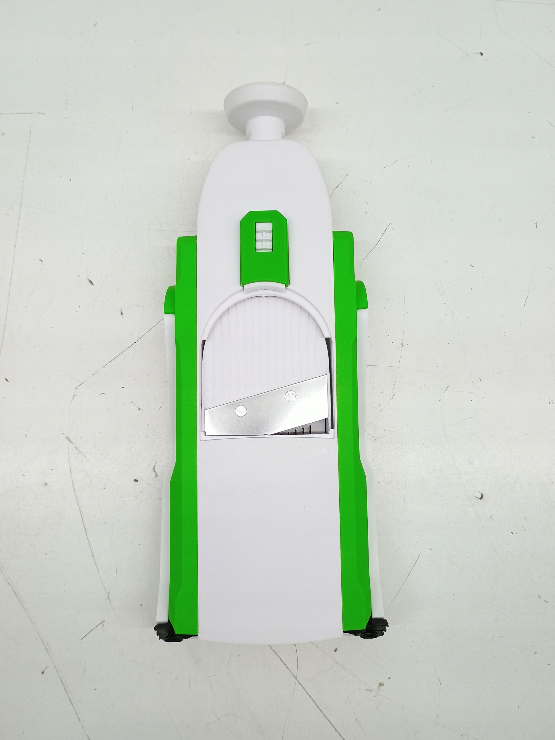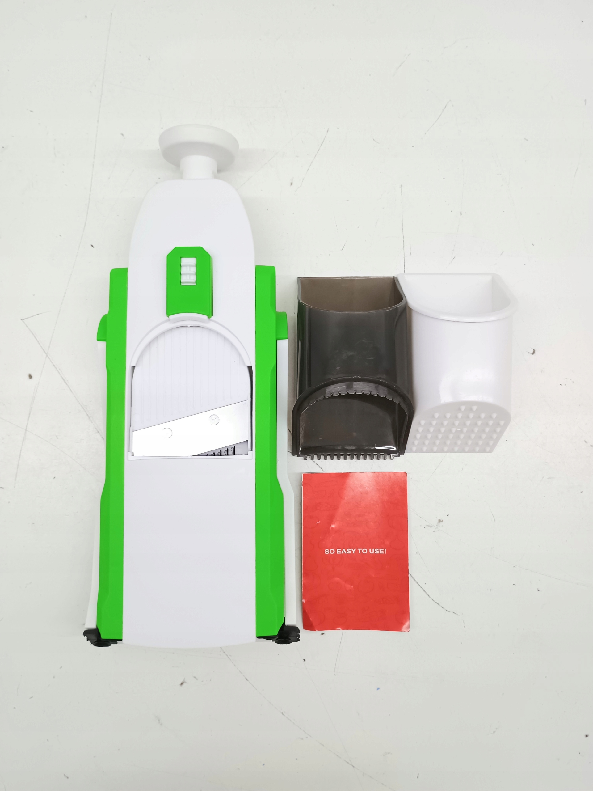 Krajarka do warzyw ma kompaktową konstrukcję, jej niewielkie rozmiary zajmują niewiele miejsca w szafce, a dołączona szczotka z łatwością usunie zanieczyszczenia z ostrza.