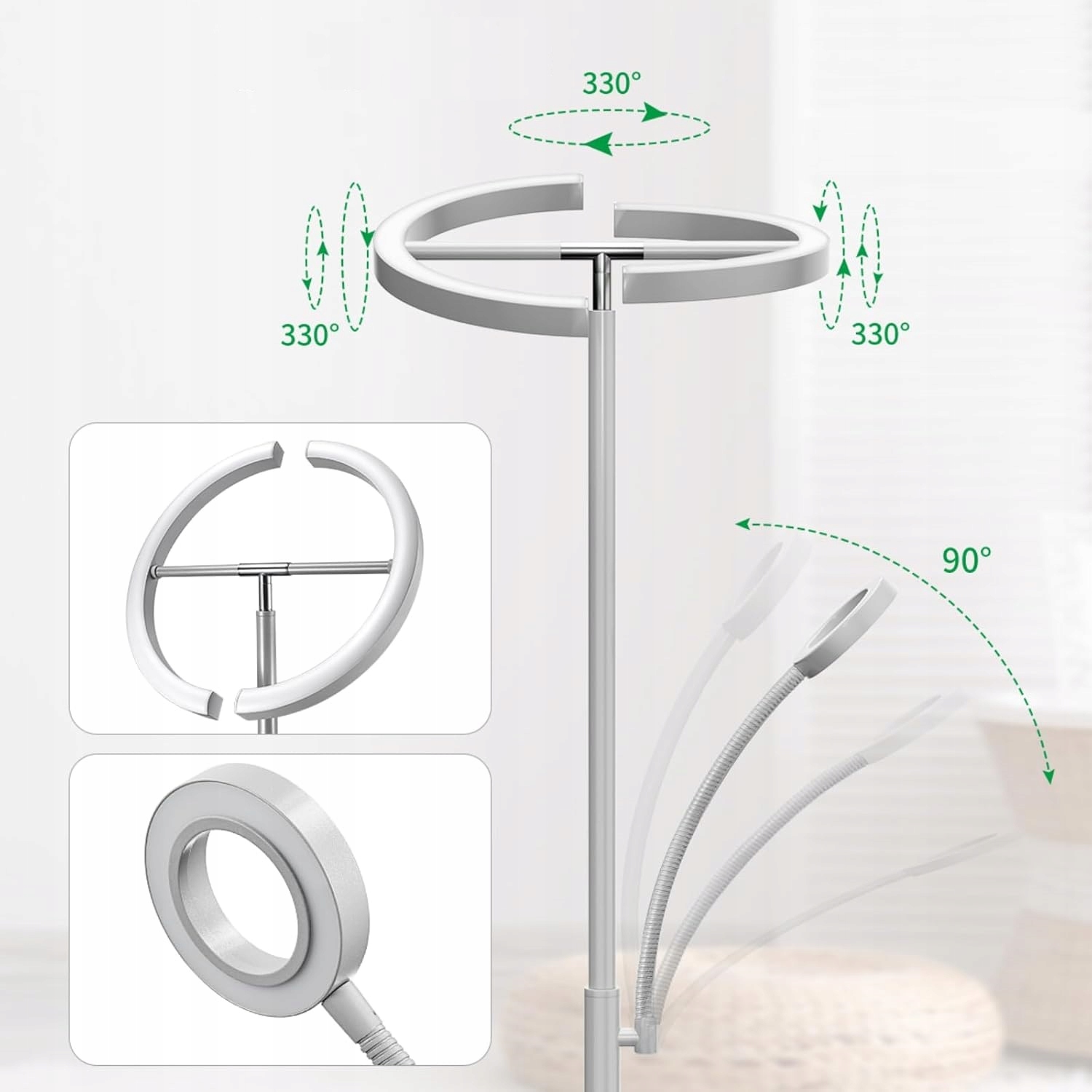 Dwa półkoliste reflektory sufitowe można obracać oddzielnie o 330° w poziomie i w pionie. Regulowaną lampę do czytania z gęsią szyją można wygiąć w pionie o 90° i teoretycznie obrócić o 360° według potrzeb. Dzięki wielopłomieniowej konstrukcji lampa podłogowa może świecić w maksymalnie trzech różnych kierunkach jednocześnie, co pozwala na skierowanie lub rozproszenie światła dokładnie tam, gdzie jest najbardziej potrzebne.