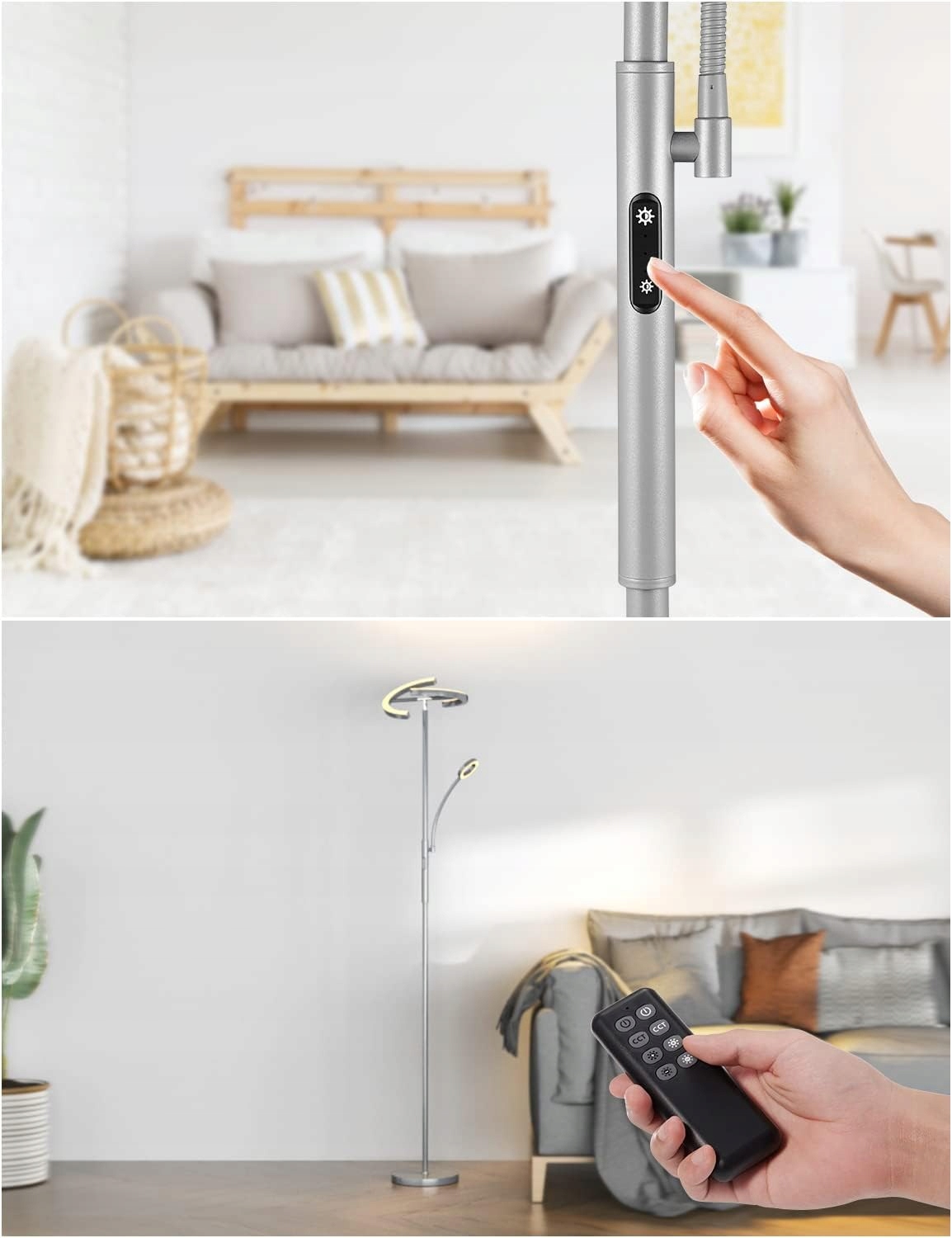Niezależnie od tego, czy jest to lampa oświetlająca sufit, czy lampa do czytania, można je kontrolować oddzielnie za pomocą tych dwóch metod. Po prostu naciśnij długo i krótko przełącznik dotykowy lub użyj pilota (w promieniu 10 m w pomieszczeniu), aby sterować lampą podłogową. Magnetyczny pilot można przymocować bezpośrednio do słupka lampy podłogowej lub do lodówki, aby zapobiec jego zgubieniu.