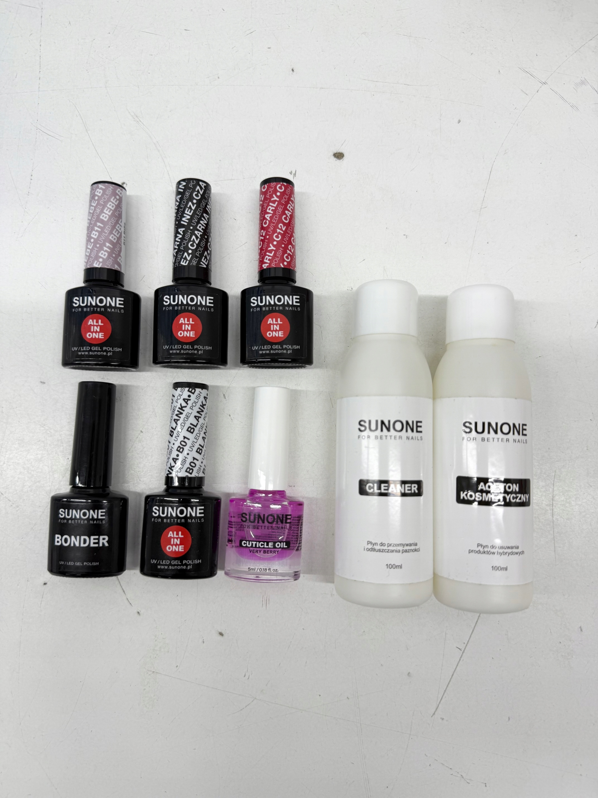Dla profesjonalnych efektów i w trosce o jak najlepszą kondycję Twoich paznokci, w zestawie znajdują się tylko profesjonalne i wysokiej jakości preparaty marki SUNONE. Aceton kosmetyczny – pomaga w usunięciu manicure hybrydowego. Cleaner – odtłuszcza i dezynfekuje płytkę paznokci. Primer bezkwasowy – płyn wytrawiający płytkę paznokcia, co zwiększa przyczepność lakieru. Oliwka do skórek i paznokci - o zapachu wiśni i truskawek, ma wpływ na idealny wygląd manicure poprzez odpowiednie nawilżenie skórek.