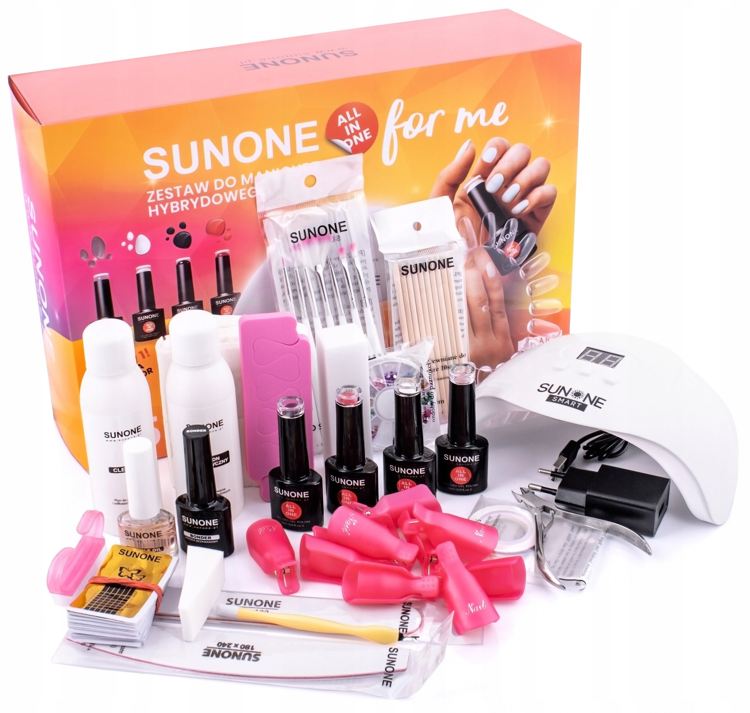 Zestaw do paznokci SUNONE All in One For Me to zestaw zwierający wszystko czego potrzebujesz, żeby zacząć przygodę z manicure hybrydowym w domowym zaciszu. W zestawie znajdują się nie tylko niezbędne rzeczy do stworzenia hybryd, ale dodatkowe akcesoria, abyś mogła eksperymentować z kształtem i kolorem swoich paznokci. Teraz przygotowanie manicure hybrydowego jest jeszcze łatwiejsze, dzięki specjalnej formule lakierów All in One.
