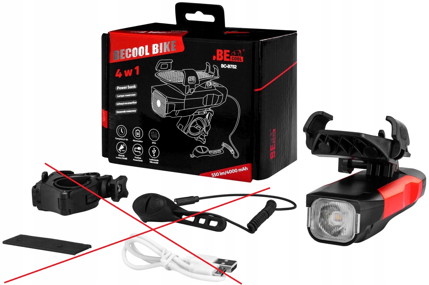 Lampka rowerowa BC-B752 marki Becool została wykonana z wysokiej jakości plastiku. Model charakteryzuje się wysoką wytrzymałością i siłą światła wynoszącą maksymalnie 550 lumenów. Akumulator o pojemności 4000 mAH pozwala na długi czas użytkowania. Model w zależności od ładowarki USB ładuje się około 6 - 8 h.