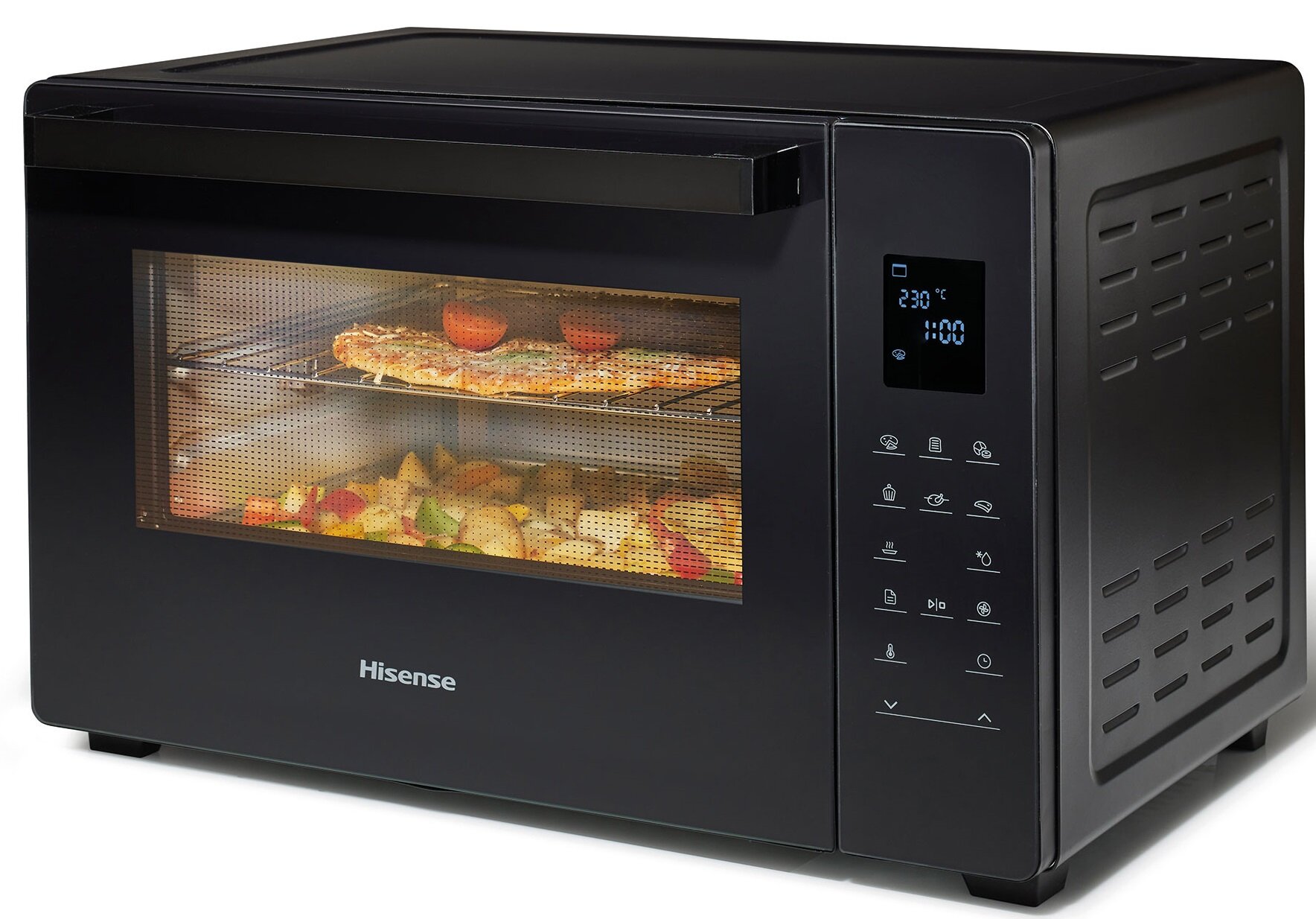 Minipiekarnik HISENSE z łatwością zastąpi pełnowymiarowy piekarnik w mniejszej kuchni. Możesz w pełni dostosować swoje użytkowanie, wybierając jedną z pięciu różnych kombinacji trybów ogrzewania (ogrzewanie górne i dolne w połączeniu z ogrzewaniem konwekcyjnym lub obiegowym powietrzem), ustawiając temperaturę w zakresie 40-230°C i czas do 180 minut.