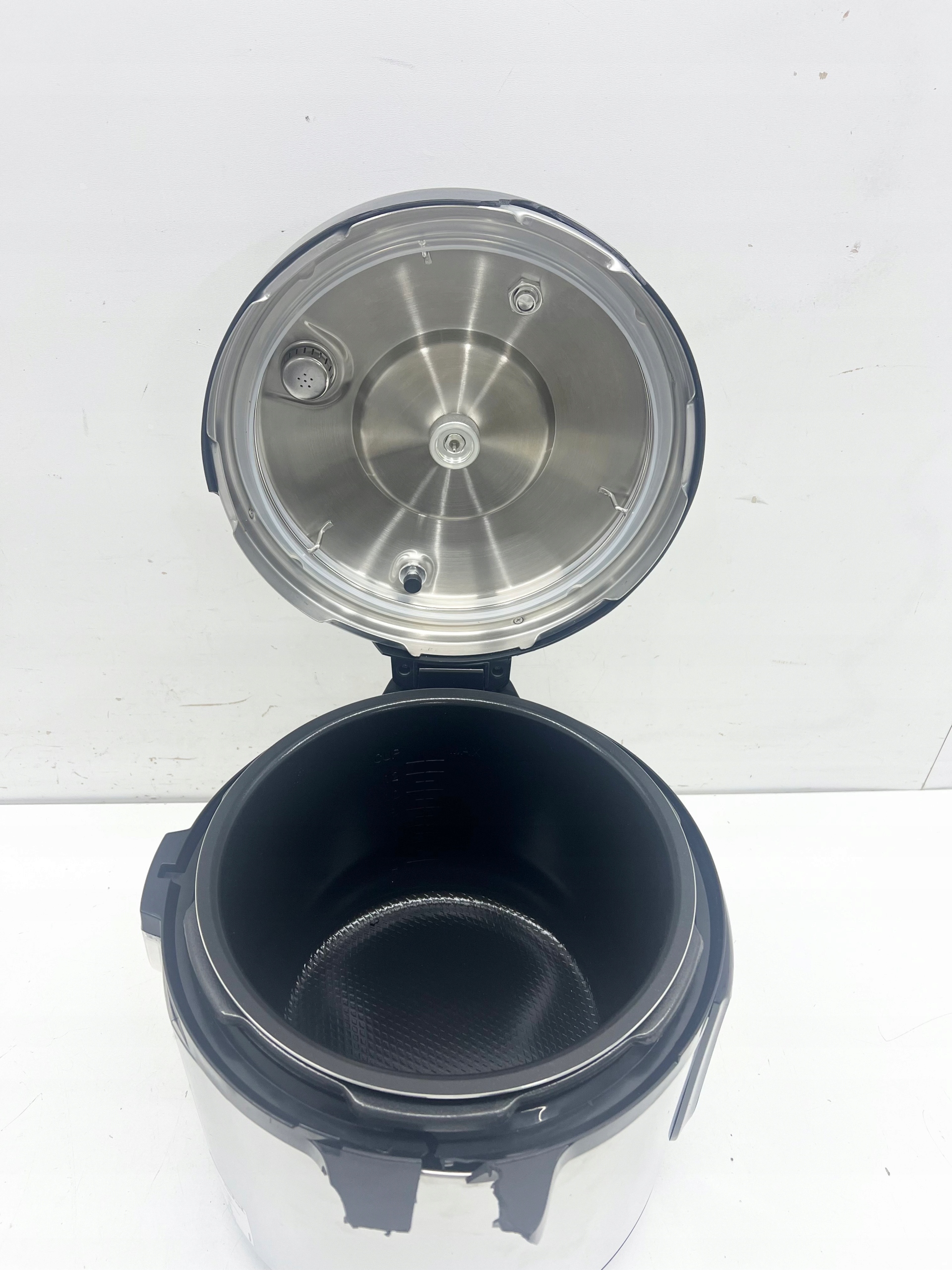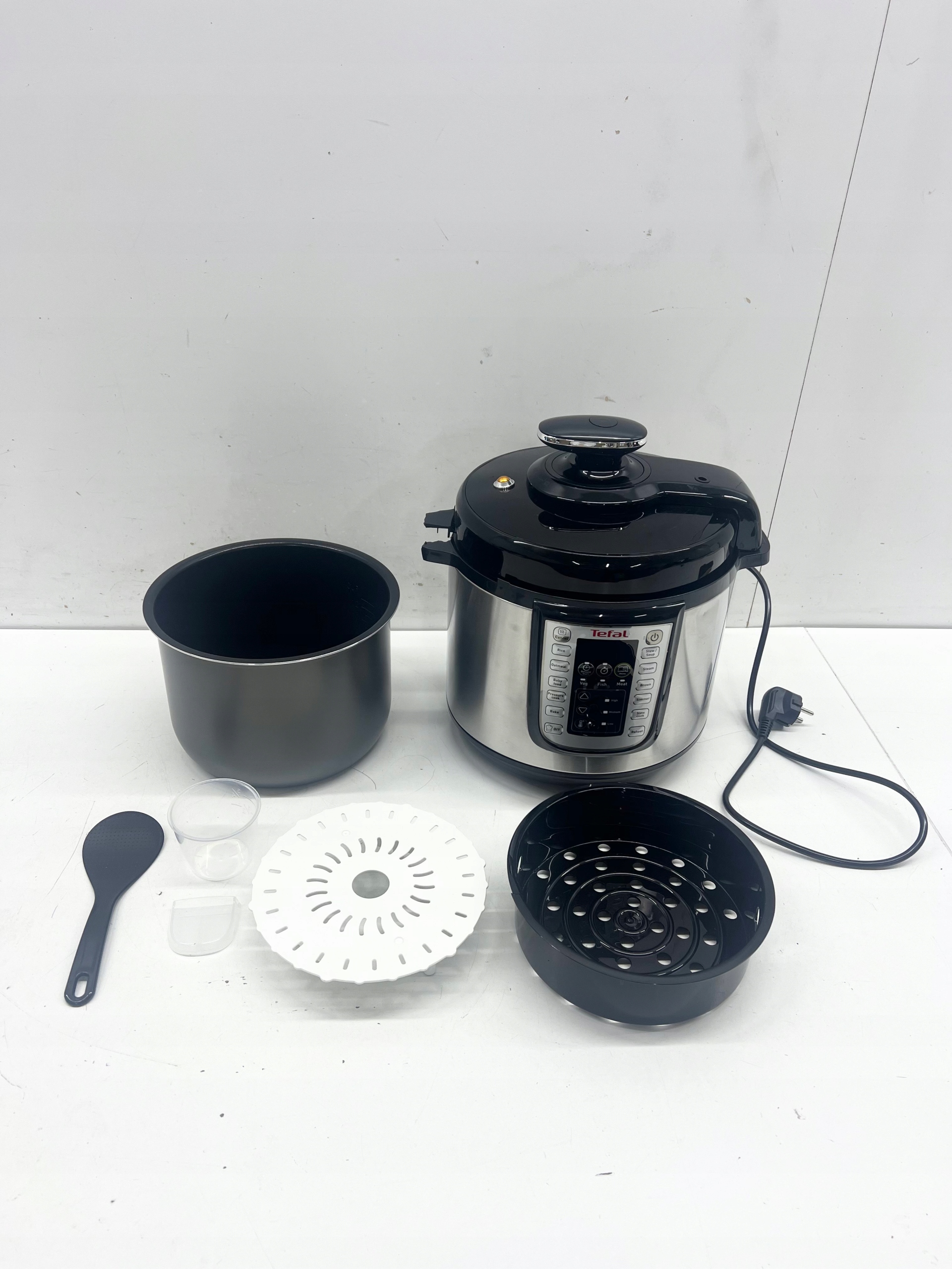 STAN TOWARU : POWYSTAWOWY, DOKŁADNIE SPRAWDZONY PRZEZ AUTORYZOWANY SERWIS, 100% SPRAWNY, STAN TECHNICZNY I WIZUALNY DOBRY, POSIADA DWA PĘKNIĘCIA NA POKRYWIE, ODŁAMANY JEDEN UCHWYT, WGNIECENIE NA OBUDOWIE ORAZ PĘKNIĘTĄ PLASTIKOWĄ MISKĘ (widoczne na zdjęciach), W ZESTAWIE BRAKUJE KORKA DO PRZEPUSZCZANIA PARY, ZAŁĄCZONE WYPOSAŻENIE DOKŁADNIE UKAZANE NA REALNYCH ZDJĘCIACH, BRAK INSTRUCKJI OBSŁUGI, OPAKOWANIE ZASTĘPCZE.