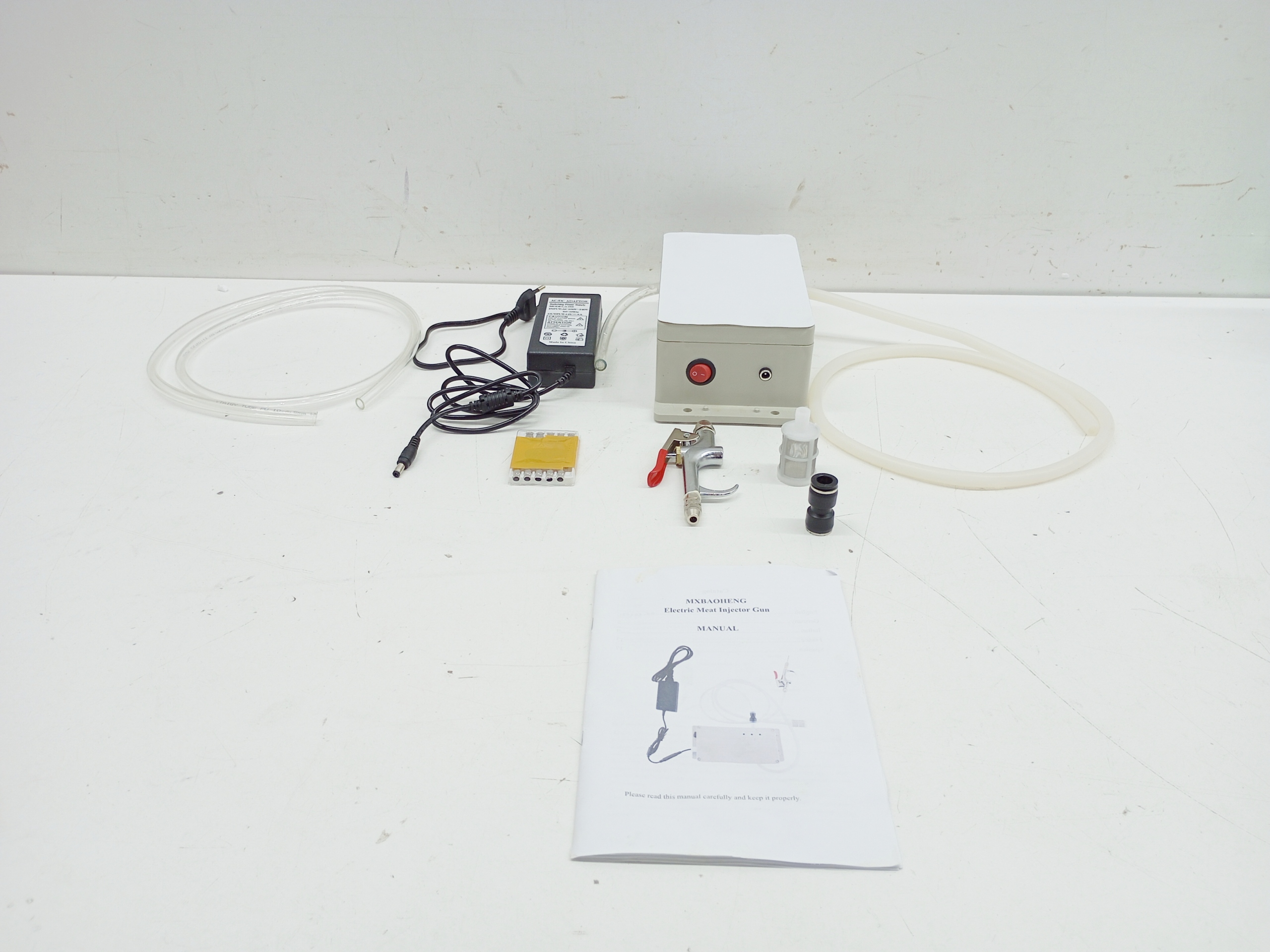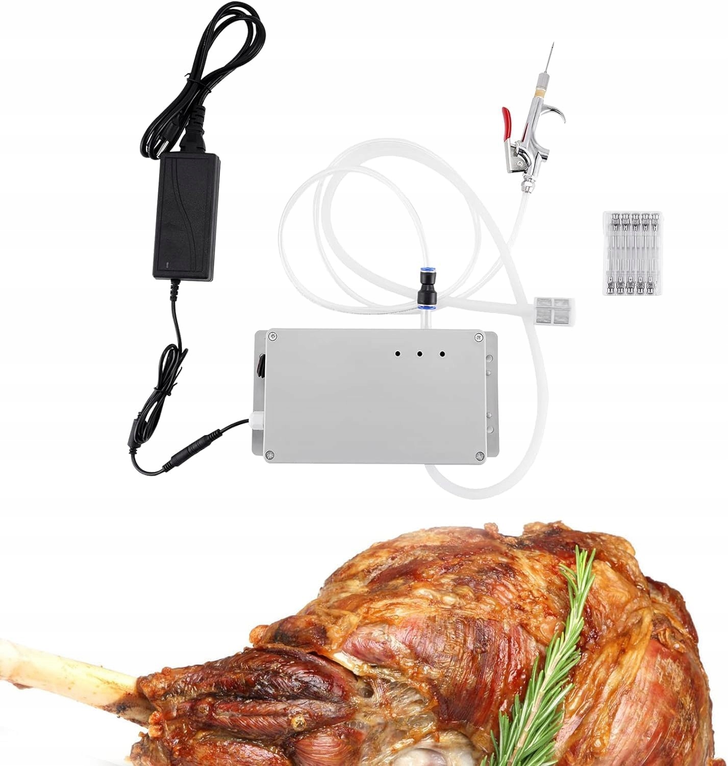 szybkozłączka, wąż silikonowy przeznaczony do kontaktu z żywnością, siatka filtrująca ze stali nierdzewnej, równomierna siatka chroniąca maszynę przed zapchaniem. Igła ze stali nierdzewnej 304, rozpylanie w czterech kierunkach, otwór na igłę z boku nie jest łatwo zablokowany przez mięso. Mocna klamra zapobiega wypadaniu igły podczas wstrzykiwania.