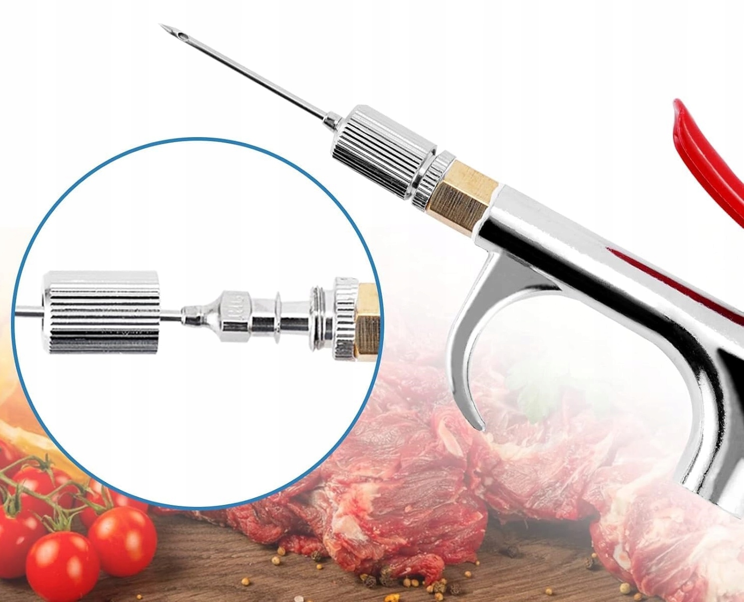 Dzięki tej strzykawce do mięsa można łatwo dodać różne marynaty/słoną wodę do grubego/cienkiego mięsa. Marynata jest równomierna, dzięki czemu mięso jest pyszne wewnątrz i na zewnątrz, a grillowane mięso jest jeszcze smaczniejsze. Wskazówka: Należy zwrócić uwagę na to, aby w marynacie nie znajdowały się duże cząsteczki, aby gospodarz się nie zatykał.