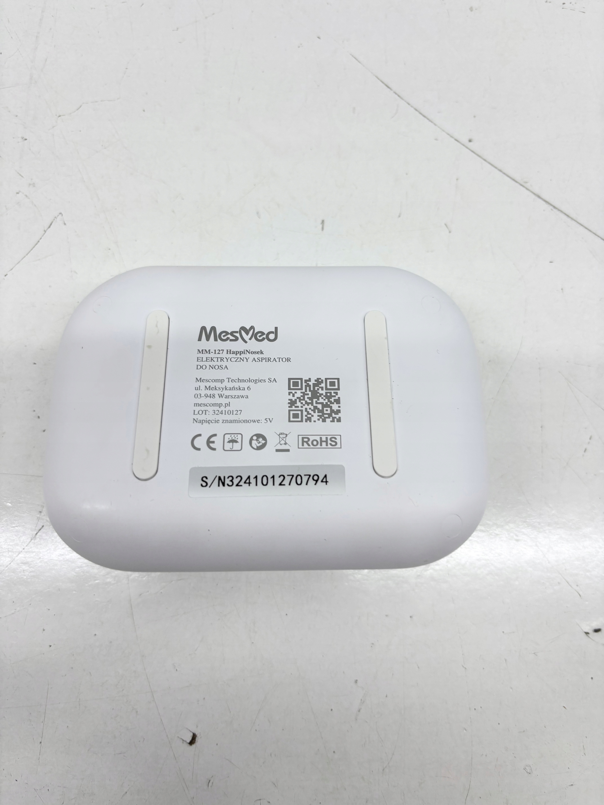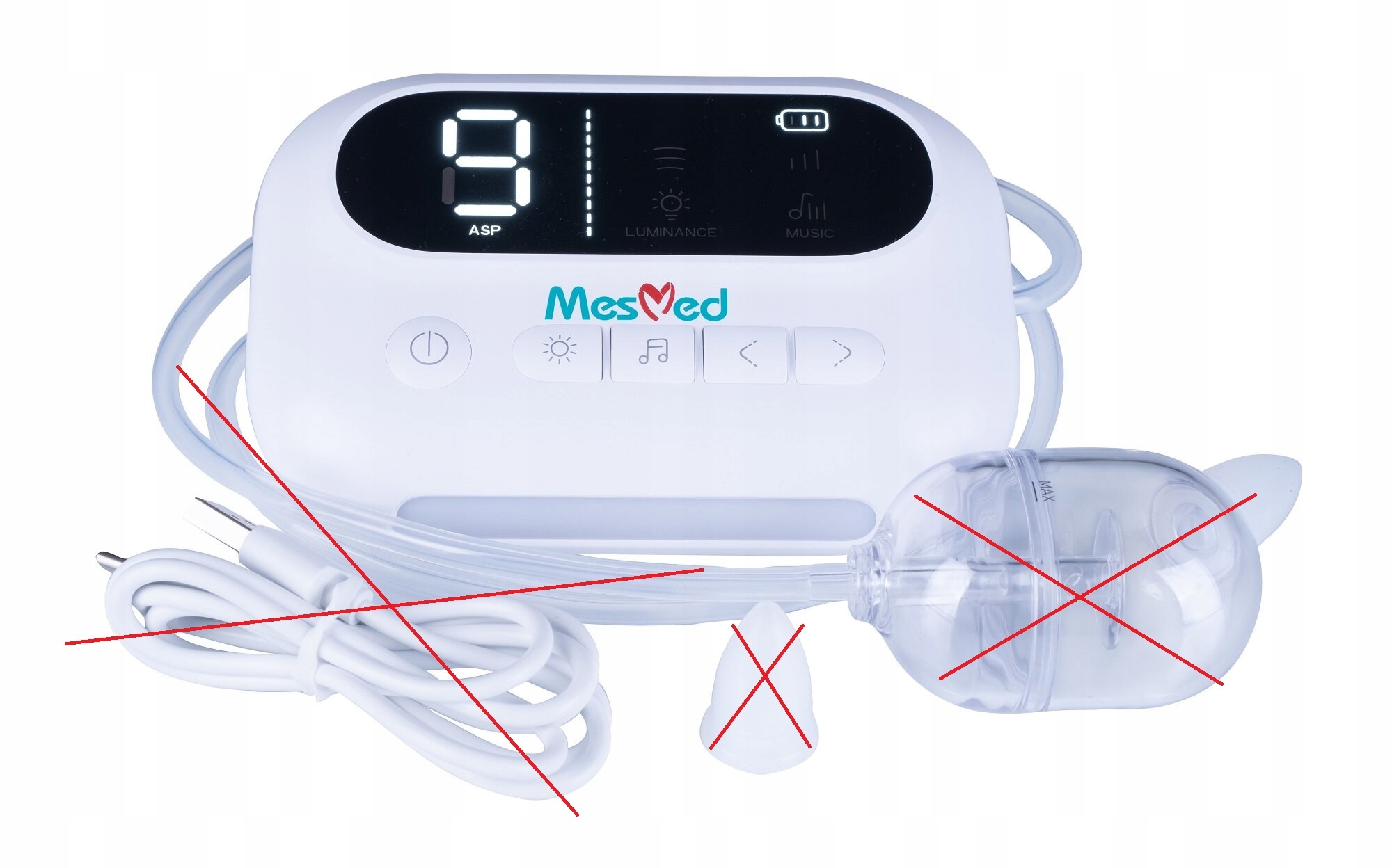 Wyposażenie: panel sterujący, pojemnik na wydzielinę, 2 silikonowe końcówki do nosa, zapasowe uszczelki, kabel do ładowania, instrukcja obsługi