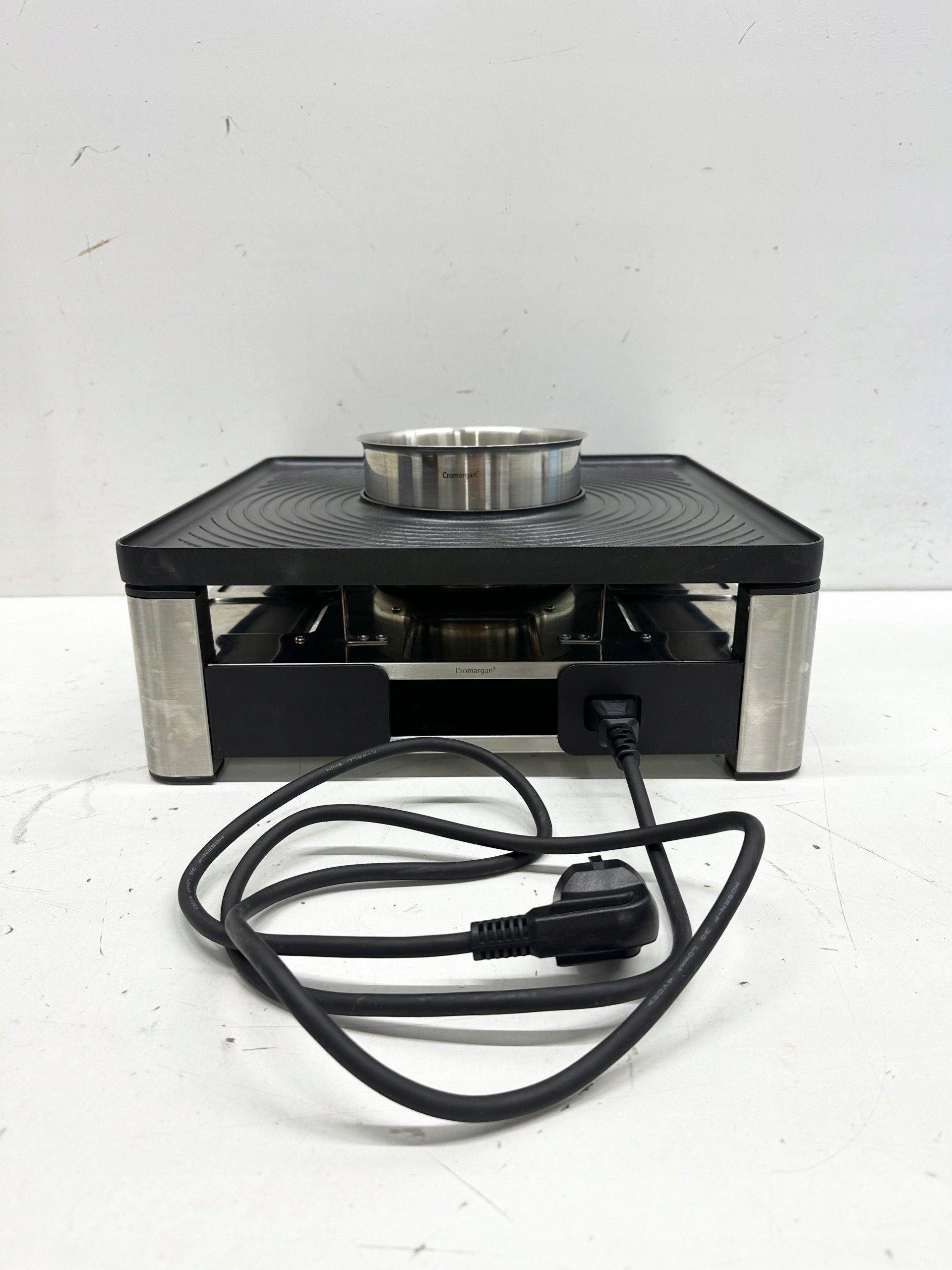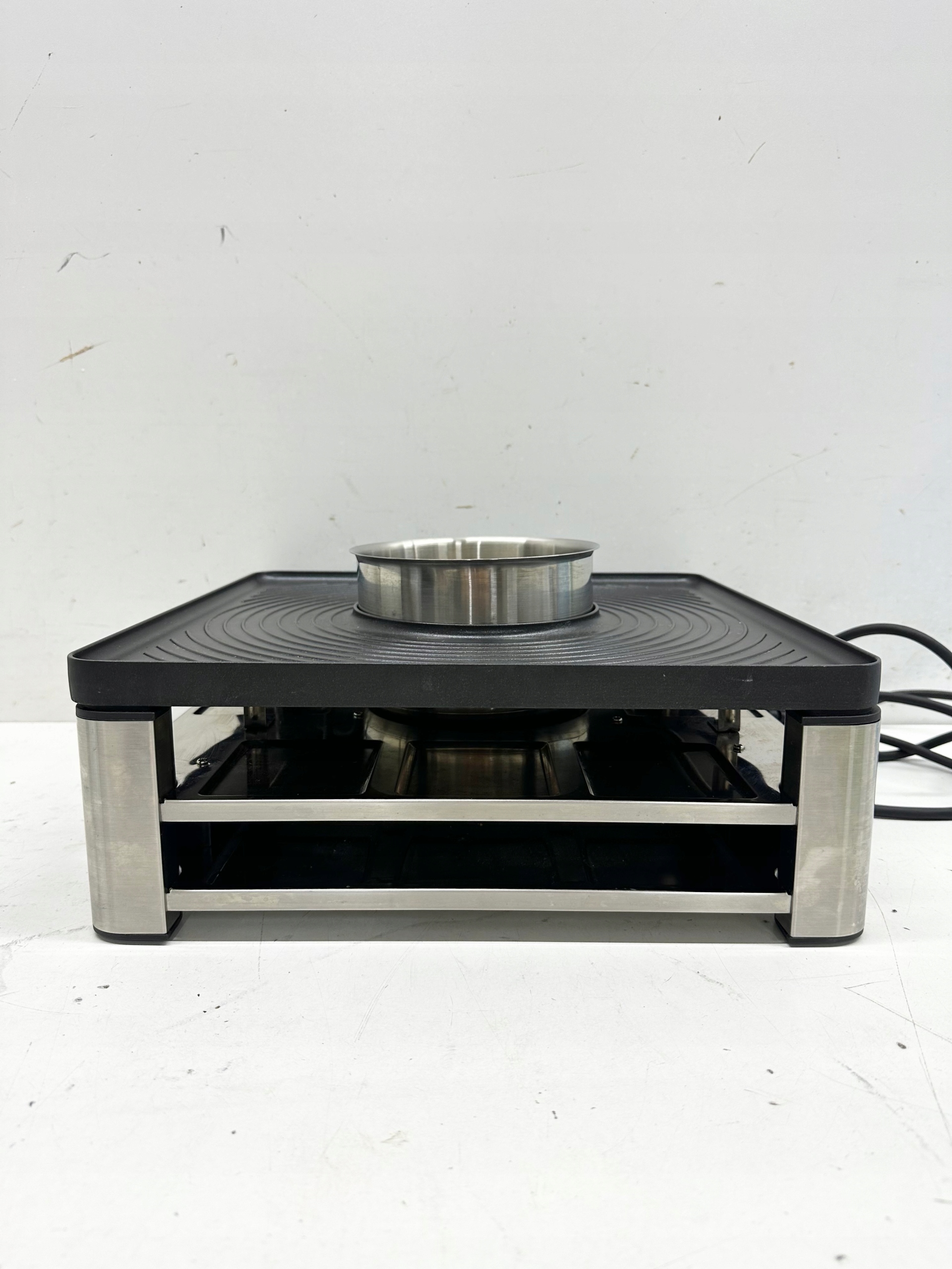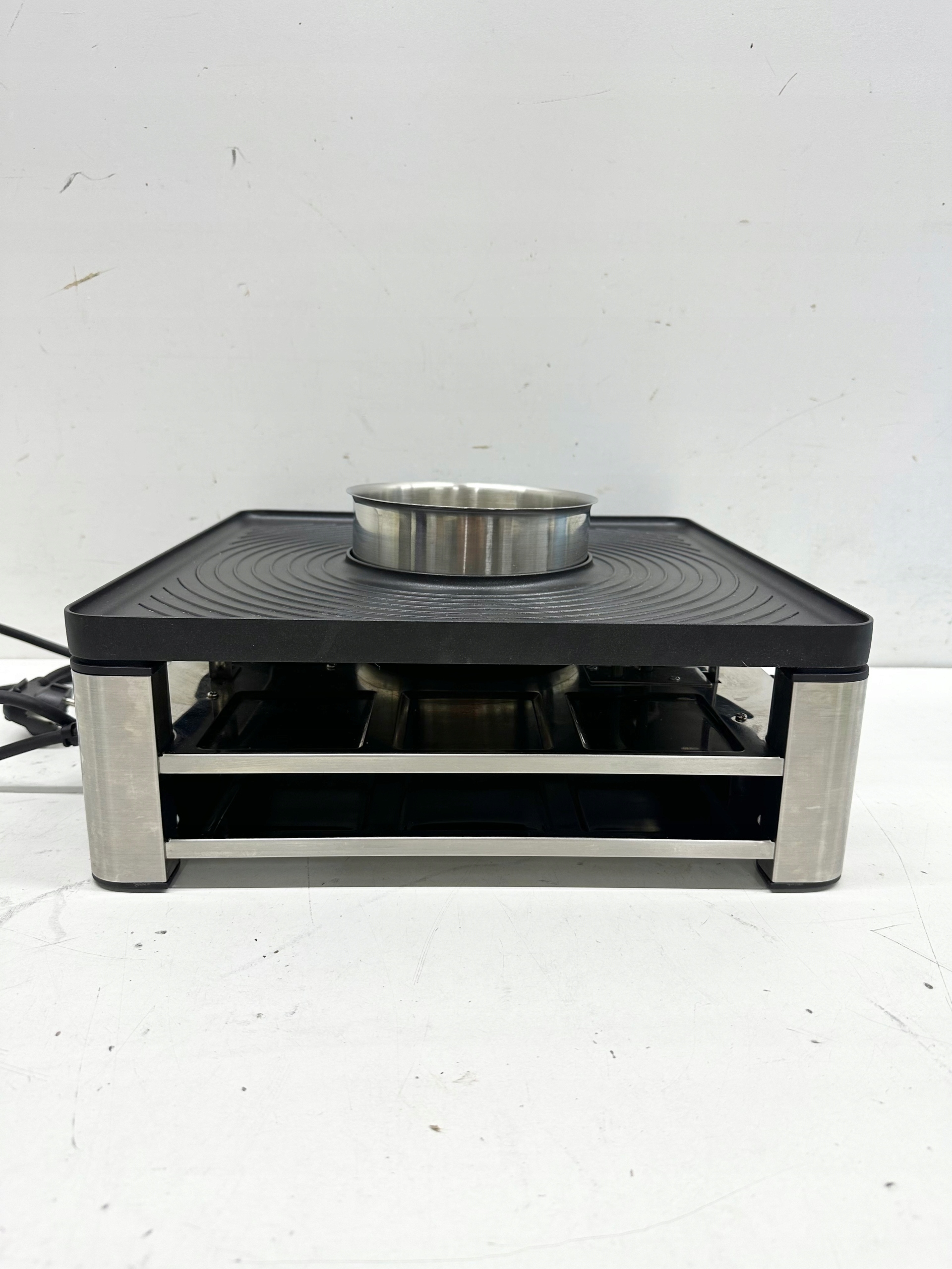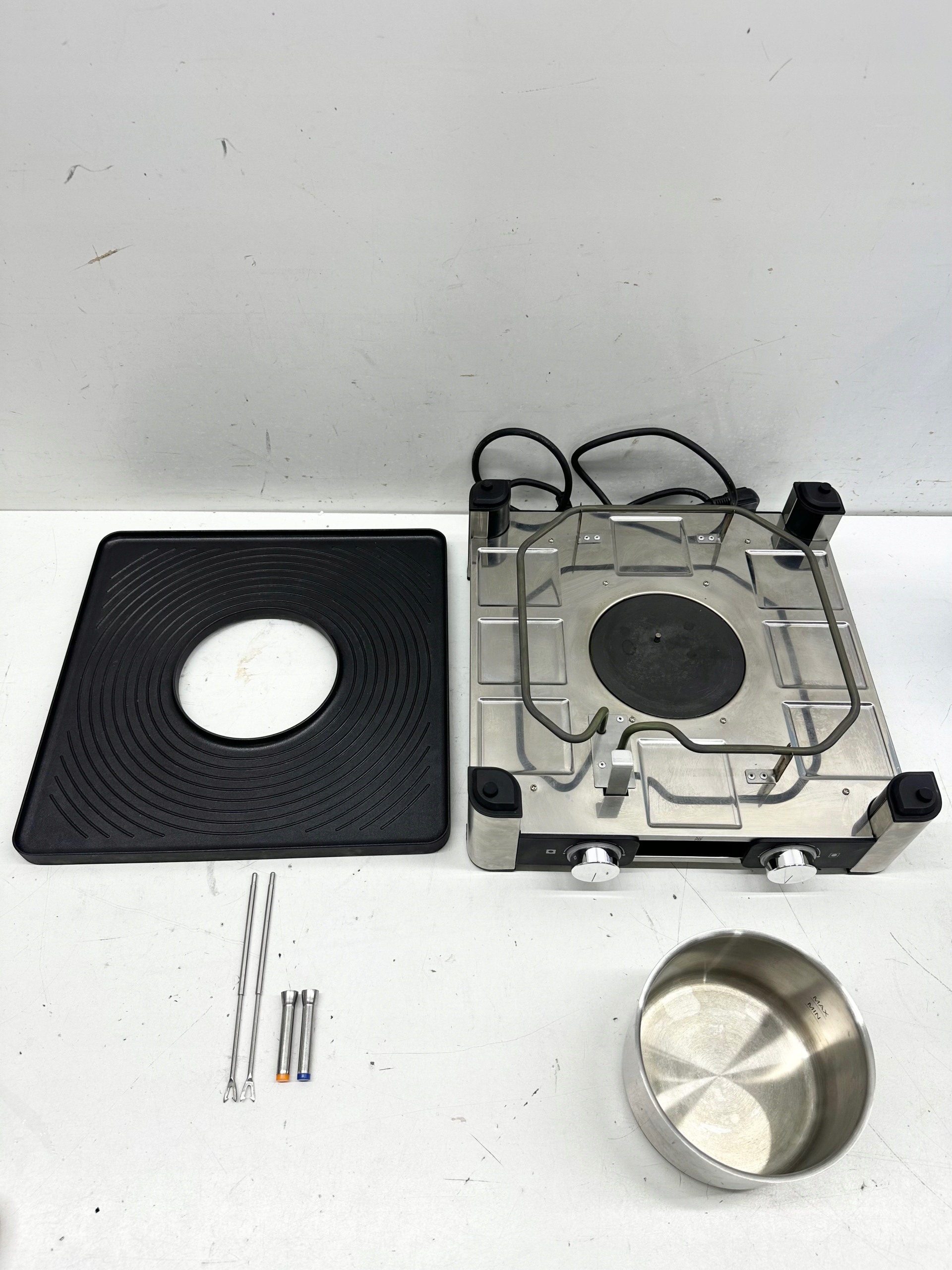 STAN TOWARU: UŻYWANY, DOKŁADNIE SPRAWDZONY PRZEZ AUTORYZOWANY SERWIS, 100% SPRAWNY, STAN TECHNICZNY I WIZUALNY BARDZO DOBRY, POSIADA LEKKIE RYSY, PRZETARCIA I ZABRUDZENIA (widoczne na zdjęciach), W ZESTAWIE BRAKUJE TACEK, SZEŚCIU PATYCZKÓW DO FONDUE ORAZ POKRYWKI (przekreślone na drugim zdjęciu) ZAŁĄCZONE WYPOSAŻENIE ORAZ STAN PRODUKTU DOKŁADNIE UKAZANO NA REALNYCH ZDJĘCIACH, BRAK INSTRUKCJI OBSŁUGI, OPAKOWANIE ORYGINALNE ZE ŚLADAMI MAGAZYNOWANIA.