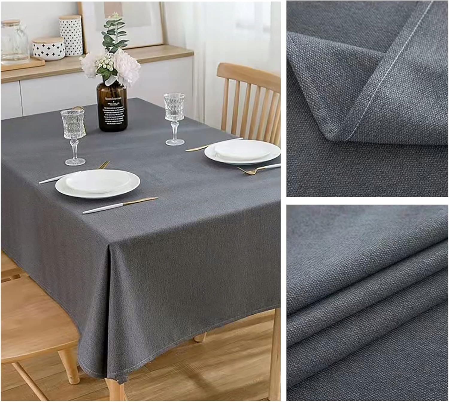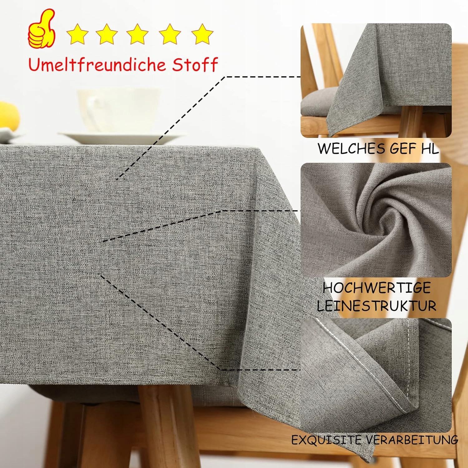 Materiał: wykonany z poliestru (o wyglądzie lnu stołowego). Jest odporny na zabrudzenia, wodoodporny, odporny na rozdarcia i ścieranie, lekki i łatwy w czyszczeniu.