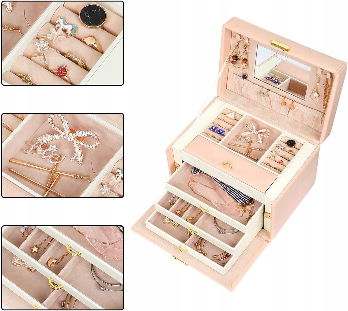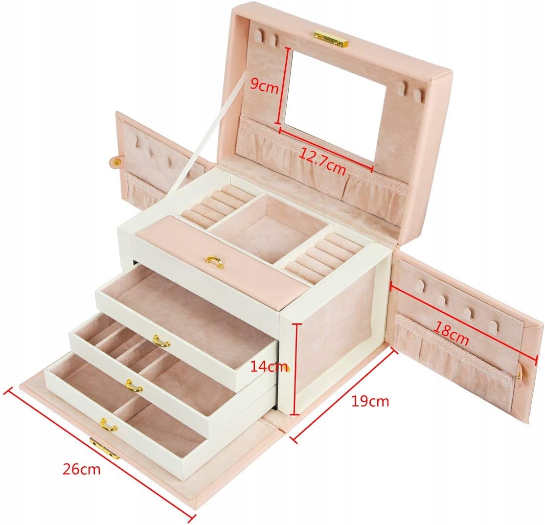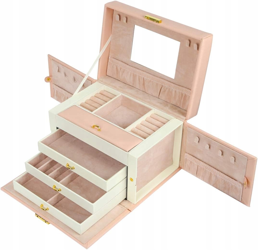 Eleganckie pudełko na biżuterię jest proste, klasyczne i nigdy nie wychodzi z mody. Wykonanie z poliuretanu, płyty MDF i aksamitu sprawia, że szkatułka na biżuterię jest stabilna i trwała. Czterowarstwowa konstrukcja zapewnia dużą pojemność i różnorodność zastosowań. Uchwyt i lusterko sprawiają, że nasz produkt jest poręczny i praktyczny. Zapinana na zatrzask i osłona przeciwkurzowa, to najlepszy wybór jeśli chodzi o ochronę biżuterii.