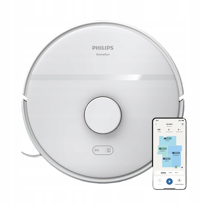 Aplikację robota Philips HomeRun opracowano tak, aby była intuicyjna i łatwa w użyciu. Zawiera instrukcje krok po kroku i pomocne filmy, które pozwalają w pełni wykorzystać możliwości urządzenia. Aplikacja komunikuje się z robotem, kontrolując i monitorując jego pracę oraz przesyłając powiadomienia dotyczące sprzątania, gdziekolwiek jesteś, a także na bieżąco pokazując, gdzie jest już posprzątane. Zdecyduj, w jaki sposób chcesz posprzątać każde pomieszczenie, wskaż robotowi, gdzie nie może jechać, lub zaplanuj sesję sprzątania, aby po powrocie do domu zastać nieskazitelnie czystą podłogę.