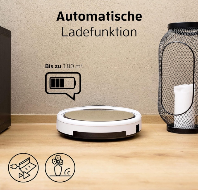 Funkcja Wet Wipe do 180 m²: Zamień pojemnik ssący na zbiornik na wodę, zamocuj od spodu moduł do wycierania z włókniną i rozpocznij proces czyszczenia. (do 120 minut czasu czyszczenia w zależności od warunków otoczenia).