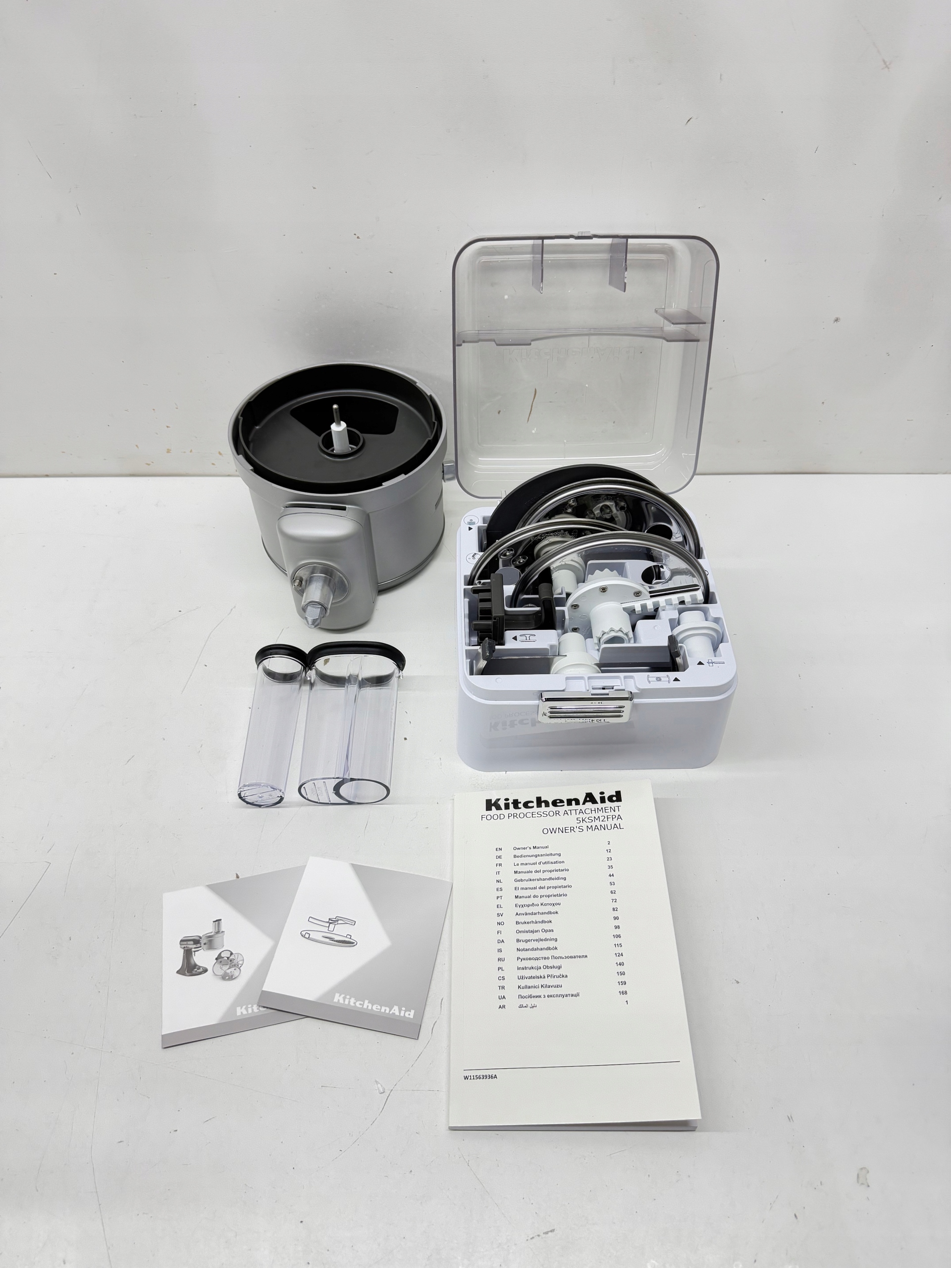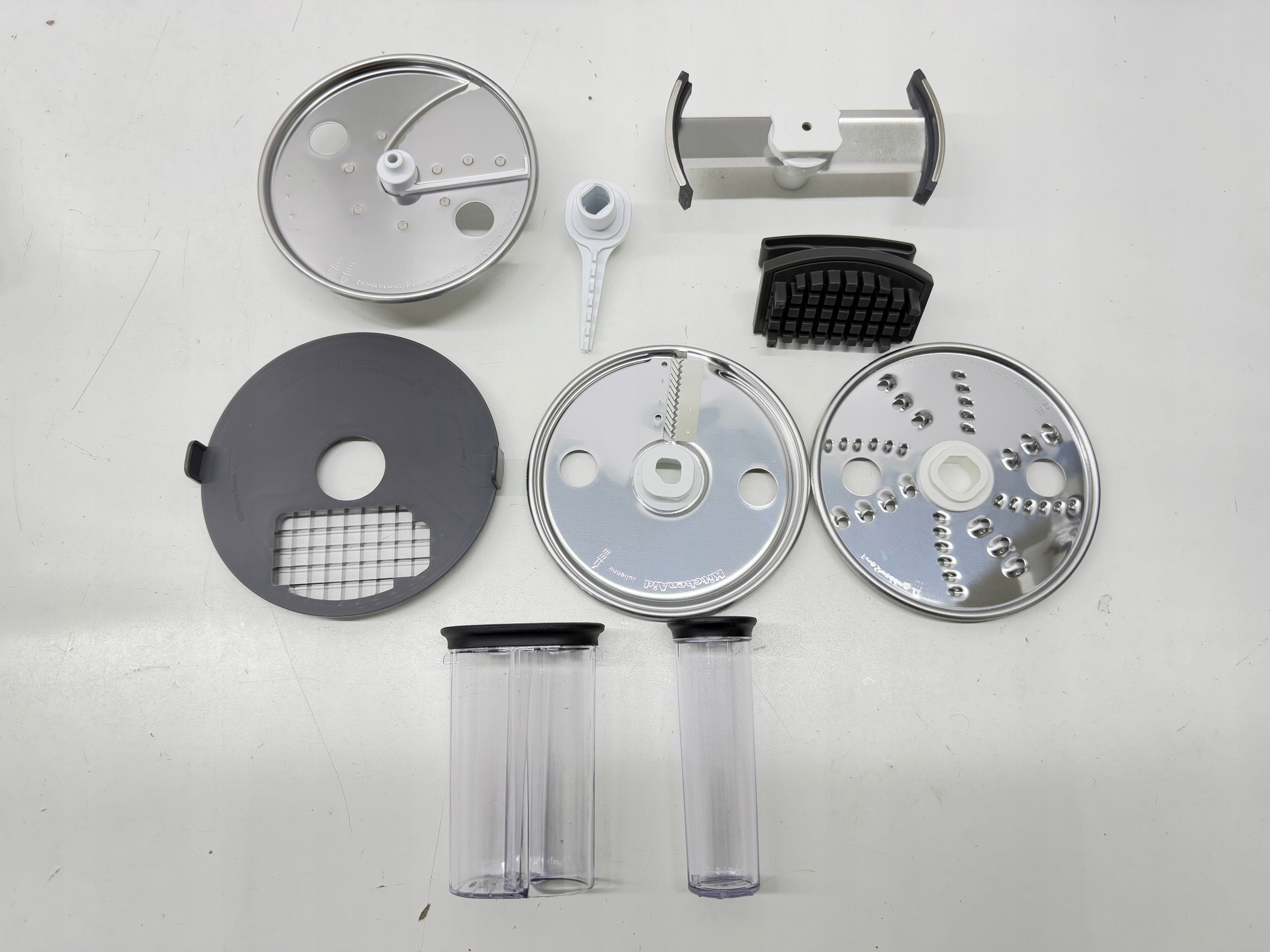 Zestaw zawiera tarczę do krojenia w kostkę o wymiarach 8x8 mm oraz narzędzie do jej czyszczenia, tarczę do krojenia w plastry z wbudowanym suwakiem do regulacji grubości, tarczę do krojenia w wiórki julienne oraz tarczę do tarcia na wiórki w dwóch wariantach grubości. Każda tarcza spełnia konkretne zadanie, co daje Ci pełną swobodę w przygotowywaniu różnorodnych potraw.