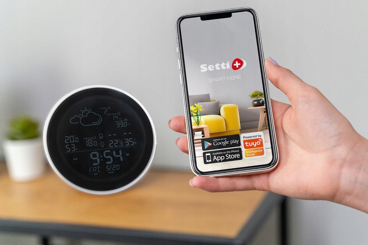 Stacja pogody SETTI+ SMS603 została wyposażona w moduł Wi-Fi oraz Bluetooth, dzięki czemu możesz połączyć ją z siecią domową i innymi urządzeniami inteligentnego domu, np. z nawilżaczem lub oczyszczaczem powietrza. W bezpłatnej aplikacji SETTI+ możesz do tego tworzyć inteligentne zdarzenia, dzięki którym np. nawilżacz włączy się automatycznie, gdy stacja pogody zanotuje wilgotność powietrza poniżej 40%.