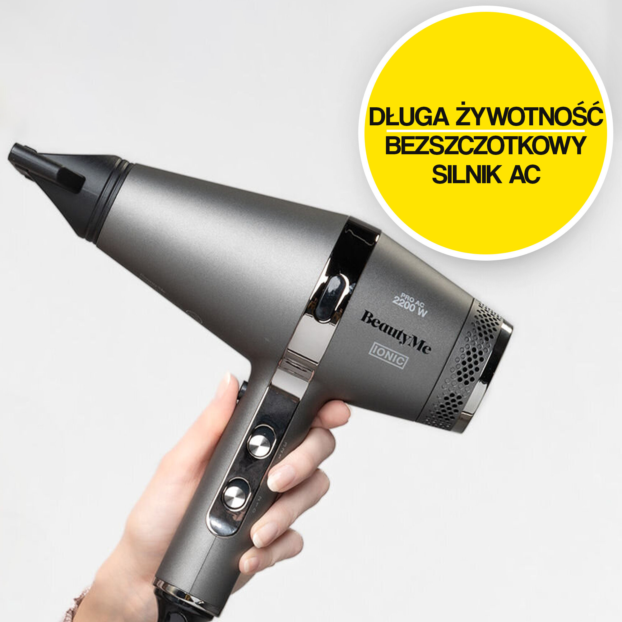 Suszarka BeautyMe HD925 o wysokiej mocy 2200 W doskonale sprawdzi się przy pielęgnacji nawet najbardziej wymagających włosów. Ma ona silnik AC, który na tle innych wyróżnia się przede wszystkim mocą i długą żywotnością. Rezygnacja ze szczotek w silniku oznacza także niski poziom hałasu i brak tarcia, a w konsekwencji zero emisji węgla.