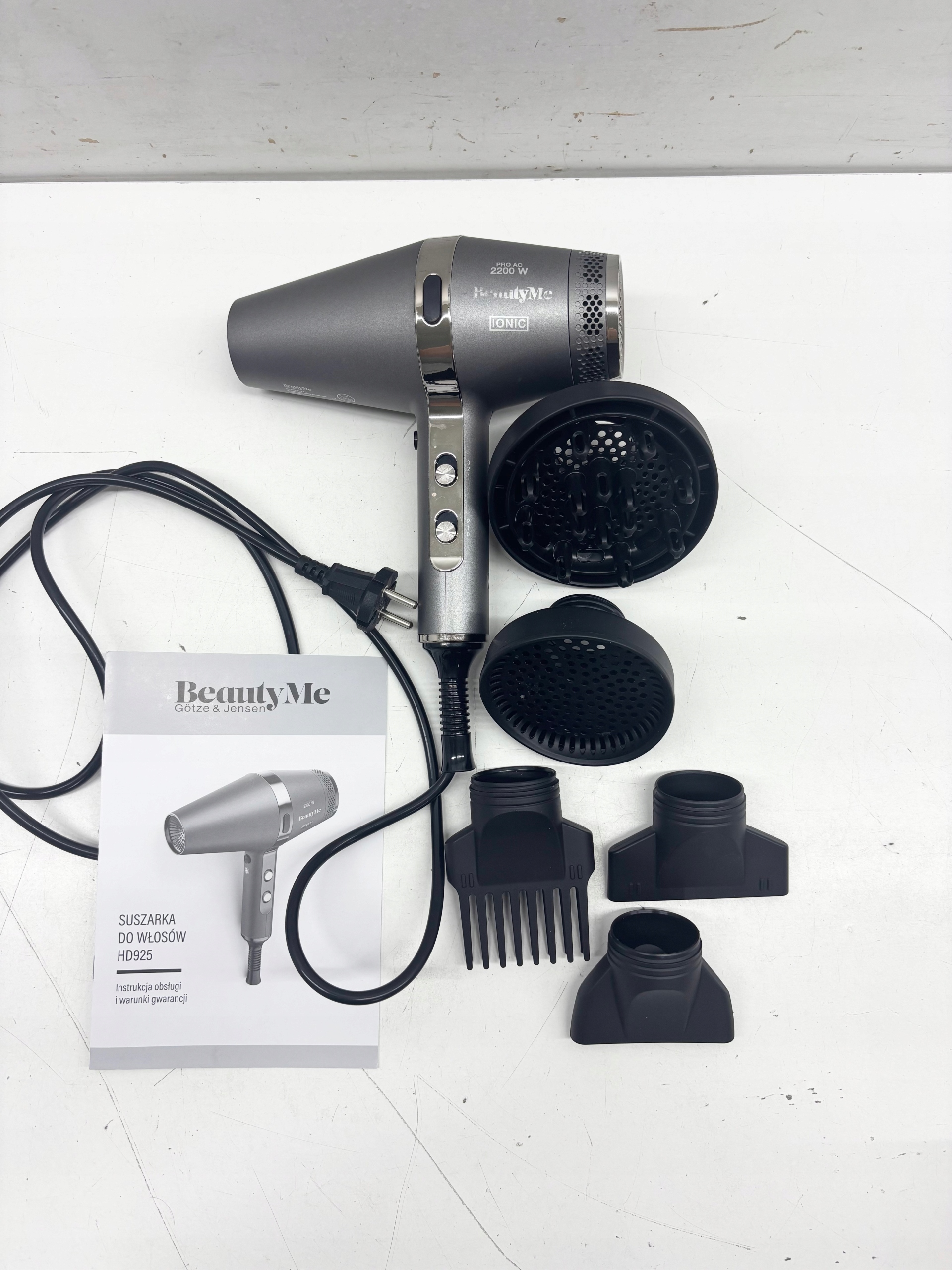 Suszarka BeautyMe HD925 o wysokiej mocy 2200 W doskonale sprawdzi się przy pielęgnacji nawet najbardziej wymagających włosów. Ma ona silnik AC, który na tle innych wyróżnia się przede wszystkim mocą i długą żywotnością. Rezygnacja ze szczotek w silniku oznacza także niski poziom hałasu i brak tarcia, a w konsekwencji zero emisji węgla.