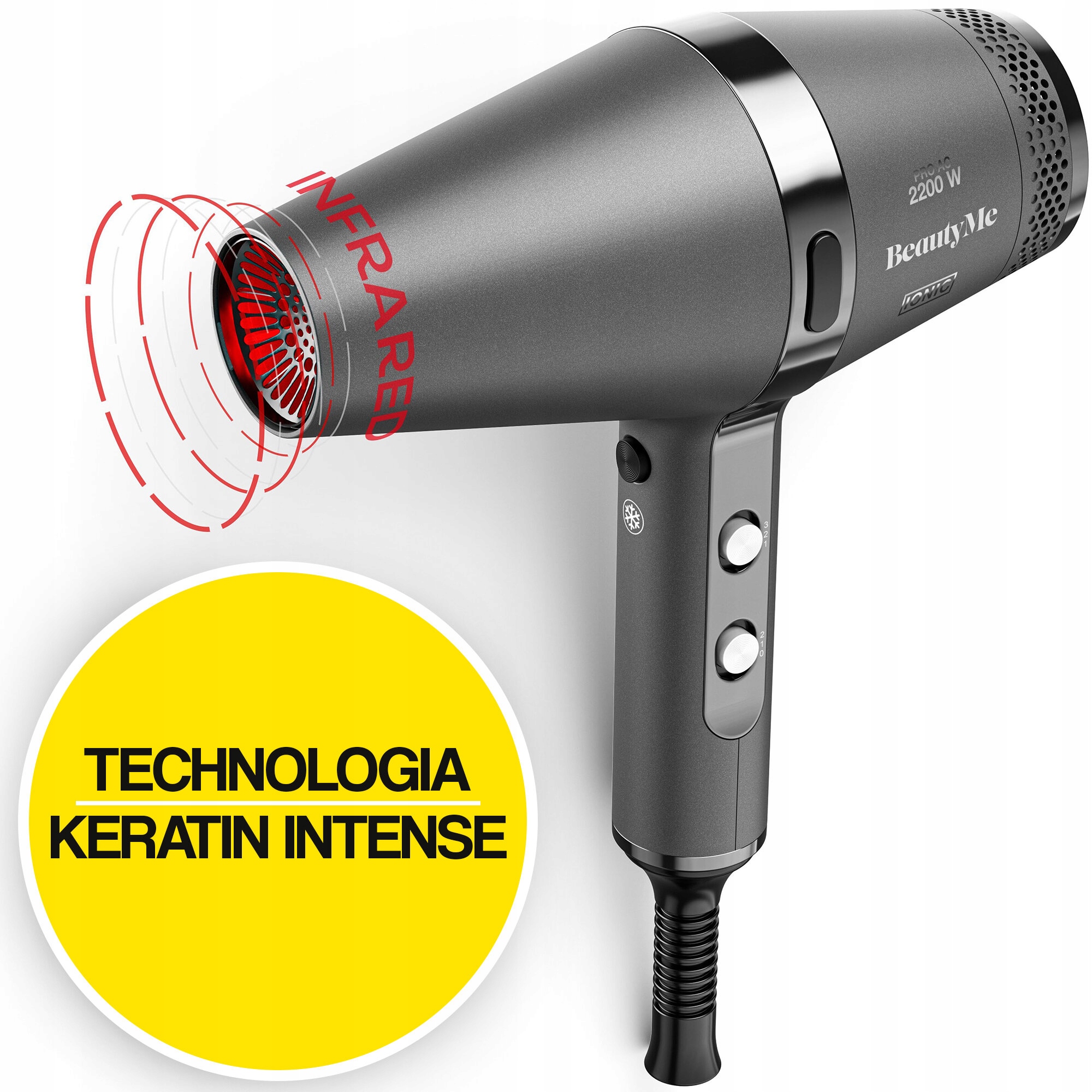 Suszarka BeautyMe HD925 została wyposażona w funkcję podczerwieni, która pomaga ochronić włosy przed przesuszeniem oraz uszkodzeniami. Dzięki tej technologii włosy są ogrzewane od wewnątrz, przez co cały proces suszenia jest krótszy. To sprawia, że włosy krócej są narażone na wysokie temperatury, a przez to zachowują więcej wilgoci, dzięki czemu wyglądają zdrowiej.
