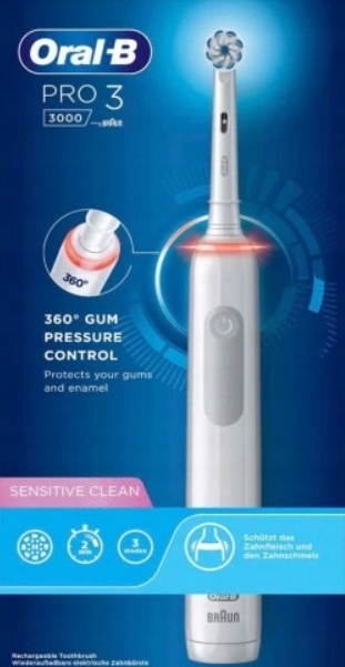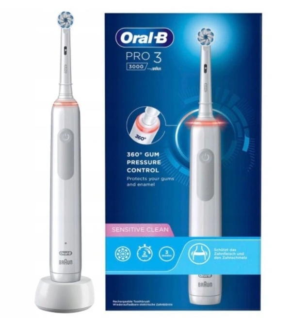 Szczoteczka rotacyjna ORAL-B Pro 3 3000 Sensitive sprawi, że Twoje zęby będą bielsze nawet już po pierwszym użyciu, ponieważ szybko usuwa przebarwienia powierzchniowe. Szczoteczka usuwa 100% więcej płytki bakteryjnej oraz zapewnia o 100% zdrowsze dziąsła w 30 dni, w porównaniu do zwykłej szczoteczki manualnej.