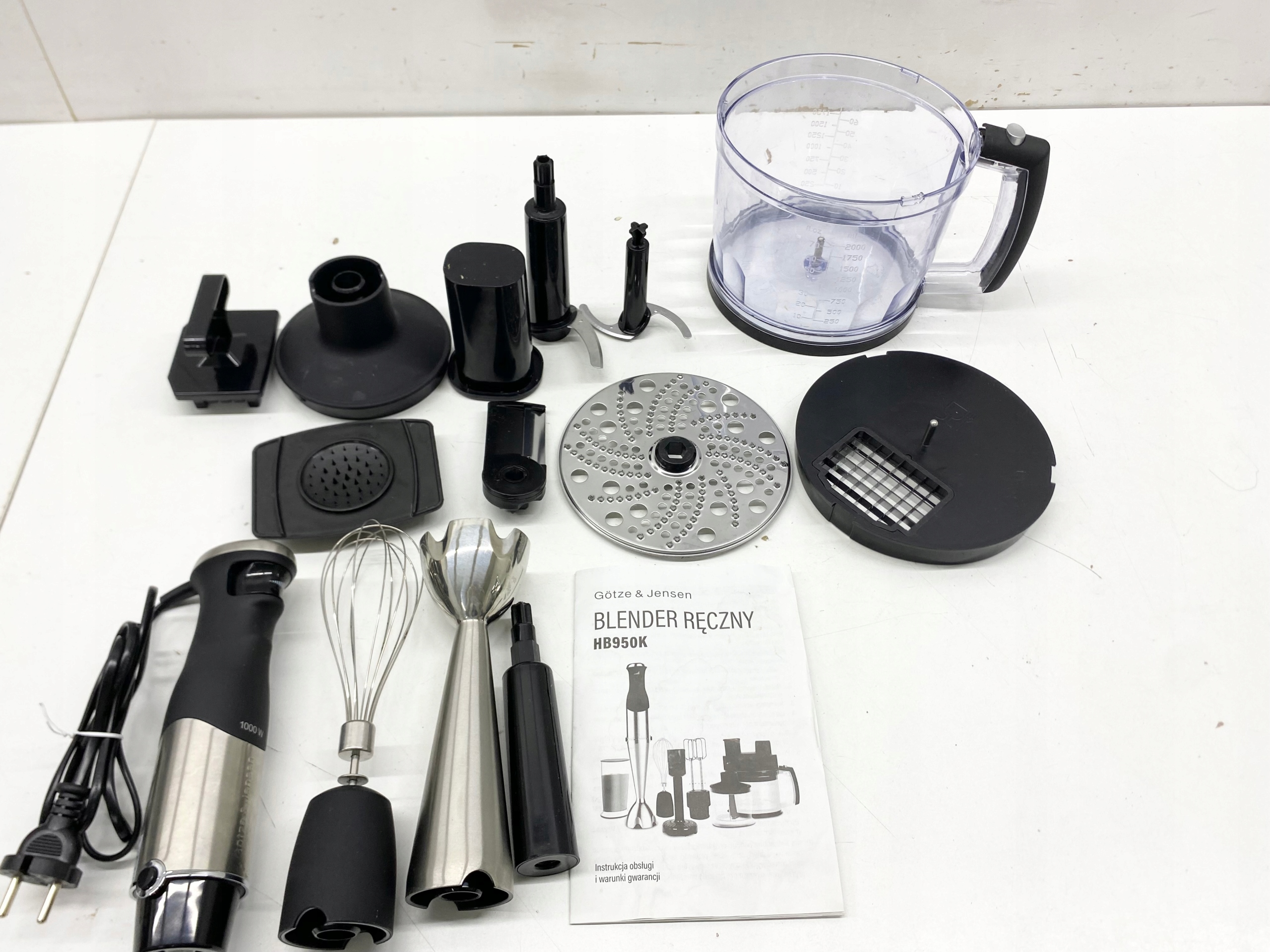 STAN TOWARU: PO REGULAMINOWYM ZWROCIE KONSUMENCKIM Z NIEMIEC, CO ZNACZY, ŻE SPRZĘT MÓGŁ BYĆ UŻYWANY MAKSYMALNIE DO 30 DNI, DOKŁADNIE SPRAWDZONY PRZEZ AUTORYZOWANY SERWIS, 100% SPRAWNY, STAN TECHNICZNY I WIZUALNY BARDZO DOBRY, POSIADA RYSY SZCZEGÓLNIE NA KUBKU DO MIKSOWANIA (widoczne na zdjęciach), W ZESTAWIE BRAKUJE: JEDNEJ TARCZY, NAKRYRKI DO POJEMNIKA 1500ML. KOŃCÓWKI DO MIKSOWANIA, MAŁEGO POJEMNIKA ORAZ POJEMNIKA DO BLENDOWANIA, DOKŁADNY STAN TOWARU ORAZ JEGO WYPOSAŻENIE ZOSTAŁY UKAZANE NA REALNYCH ZDJĘCIACH NASZEJ AUKCJI,PRODUKT POSIADA INSTRUKCJĘ W JĘZYKU POLSKIM, ORYGINALNE OPAKOWANIE ZE ŚLADAMI MAGAZYNOWANIA .