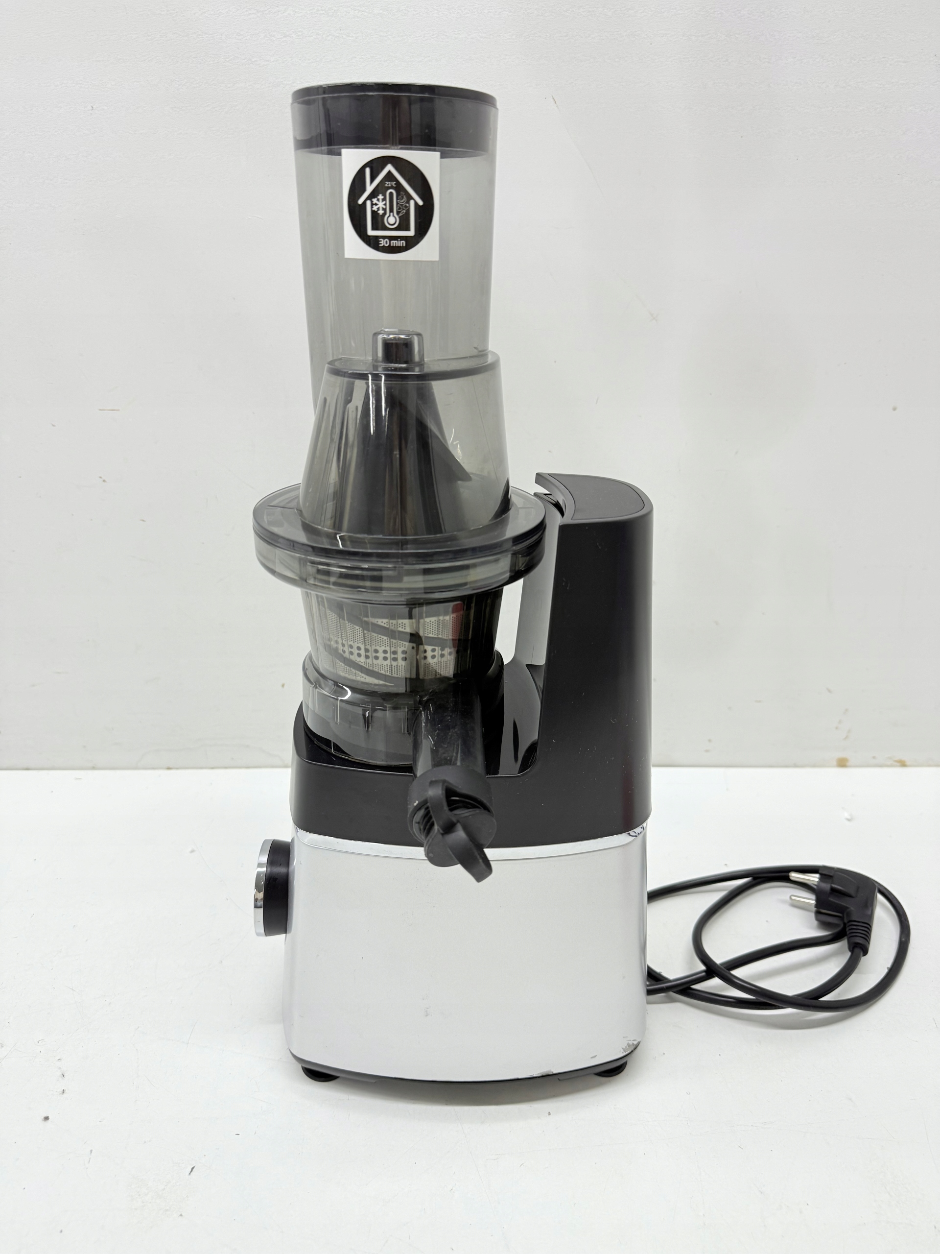 Zapobiega kapaniu soku z odpływu na stół lub blat oraz umożliwia wstrzymanie wypływu soku w każdym momencie pracy.